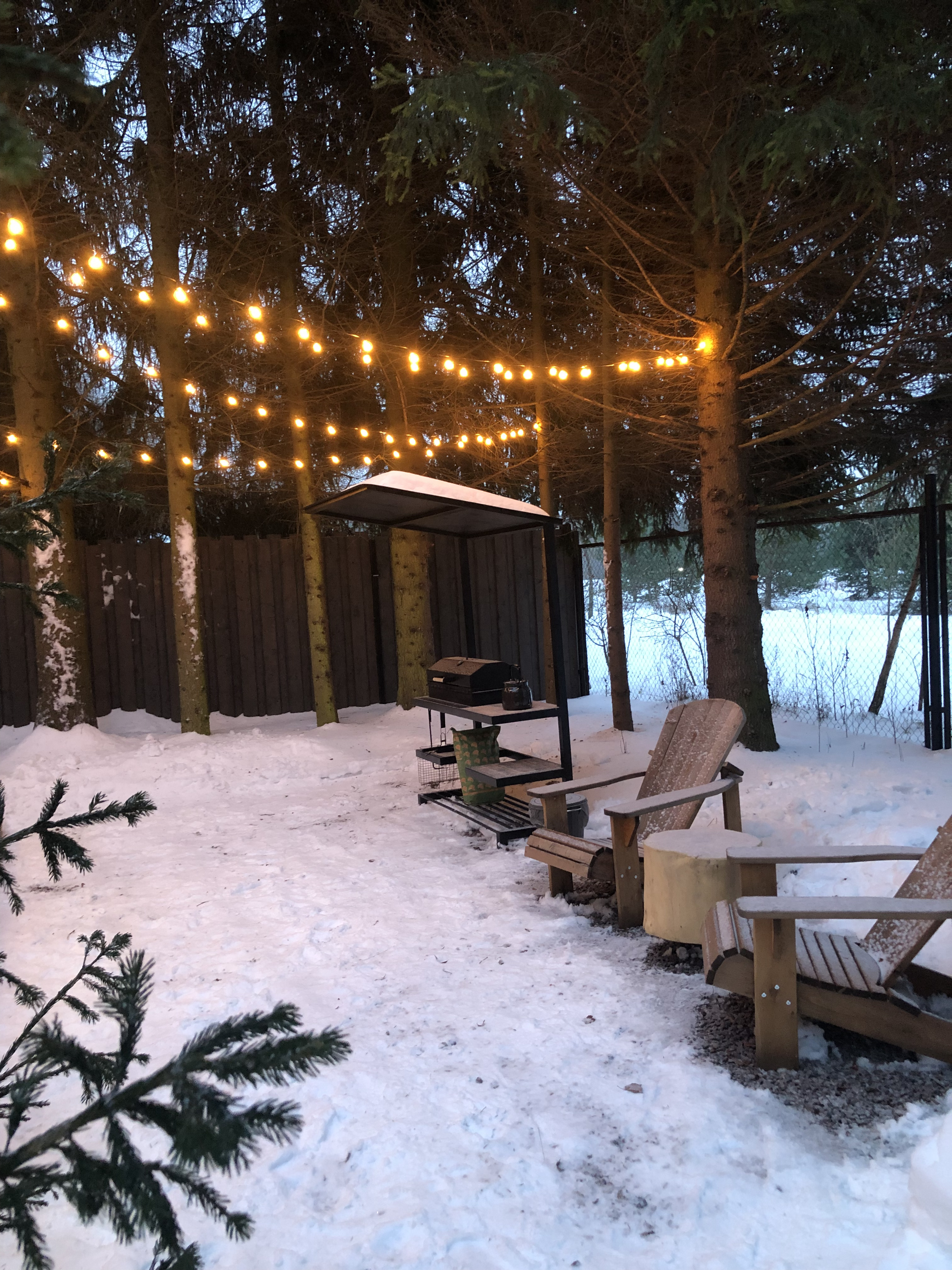 Веранда с шезлонгами, уютное место для отдыха на свежем воздухе и зона барбекю.