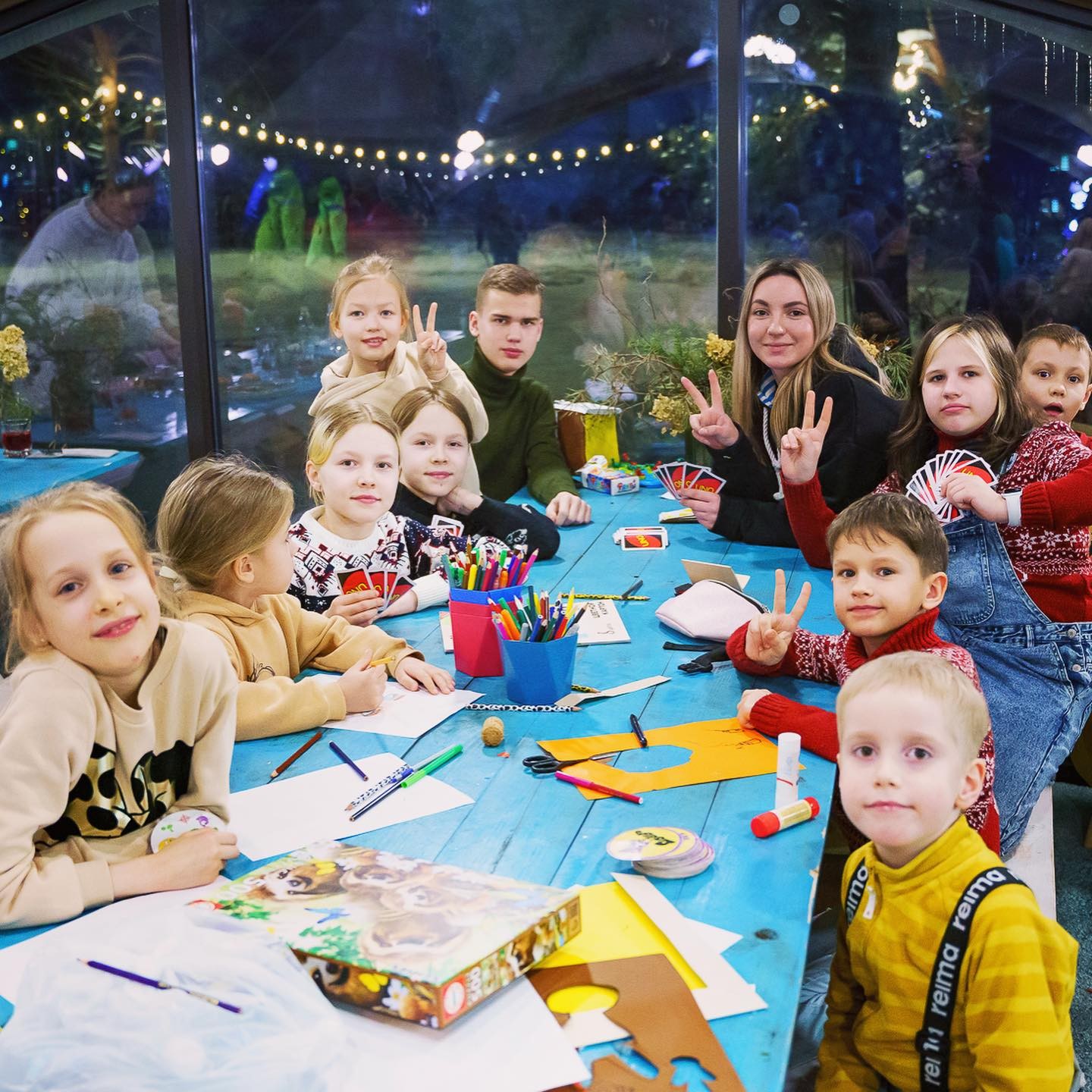 — ближе к вечеру: все ребята собираются вместе за настольными играми, такими как «Имаджинариум», «Кто я есть», «Дубль», «Шахматы», «Шашки», «Мафия», для самых маленьких есть конструкторы Лего;