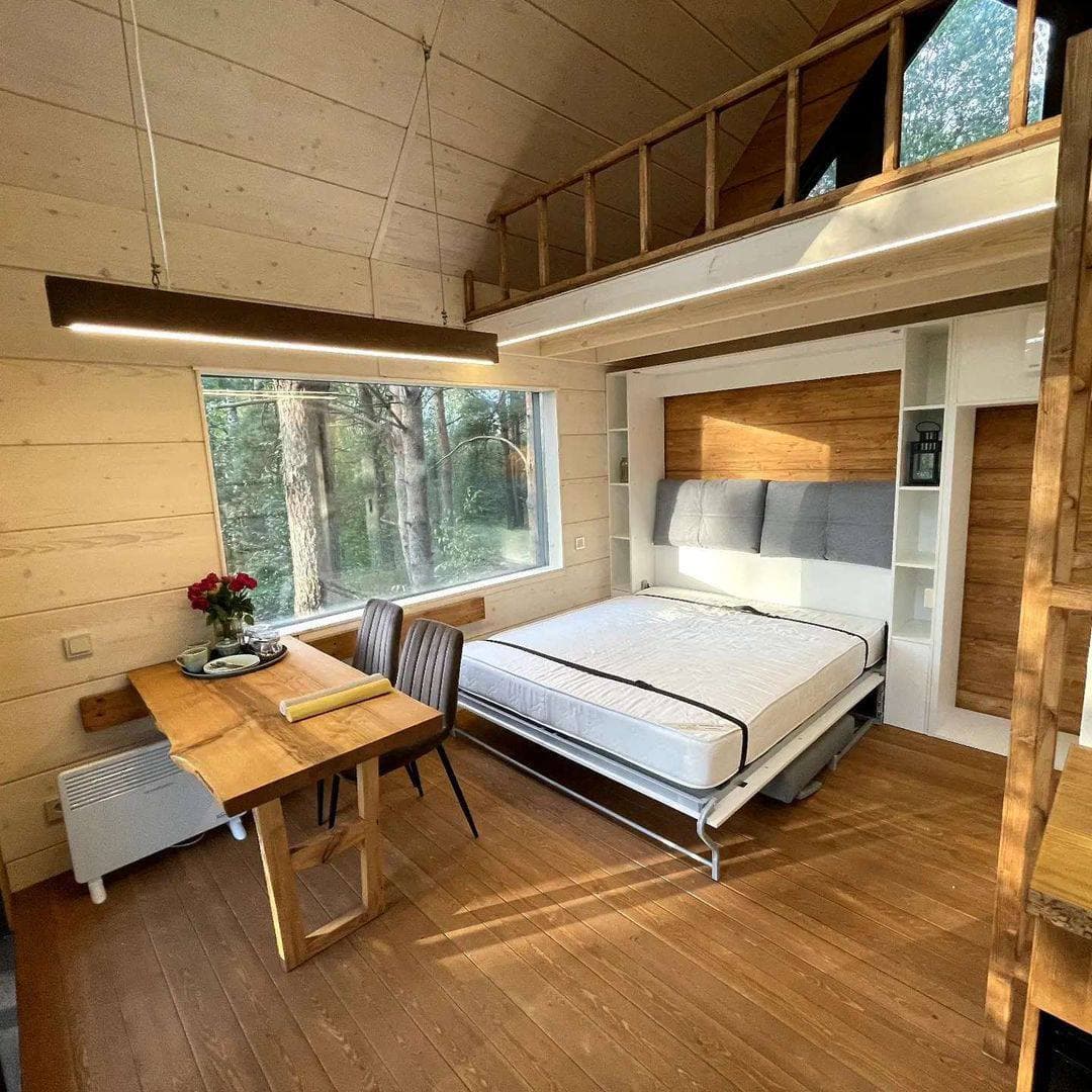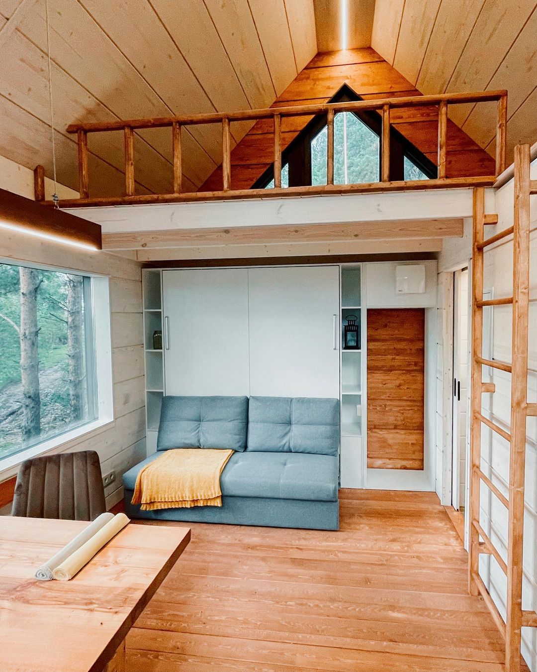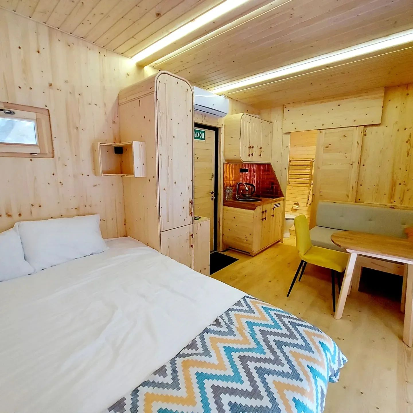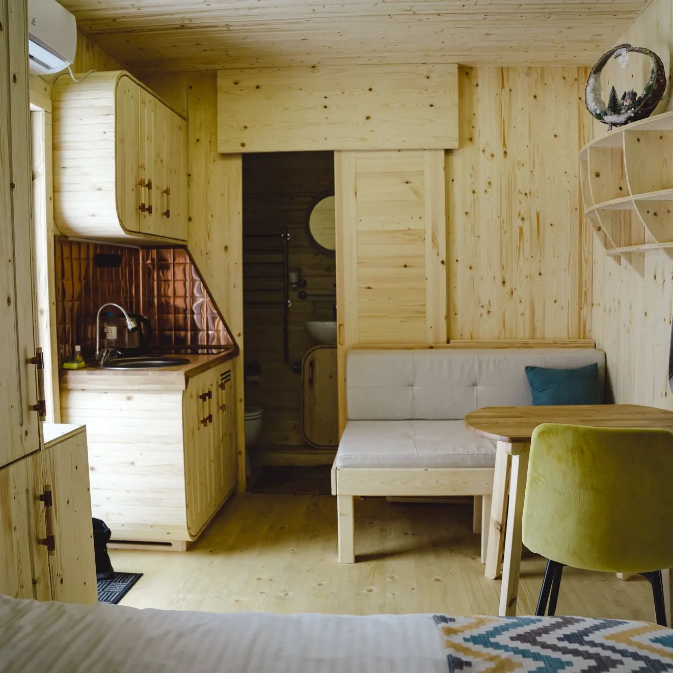 Это очень уютный экодомик, напоминающий нам телевизор, в котором каждый сантиметр пространства использован продуманно. Дом собран на каркасе из сосны, встроенная мебель сделана так же из этого дерева! Утеплитель — максимально экологичен — на основе льна. И он очень приятный тактильно. По тёплому полу так приятно ходить босиком, а ладонями ощущать приятную бархатистость дерева.