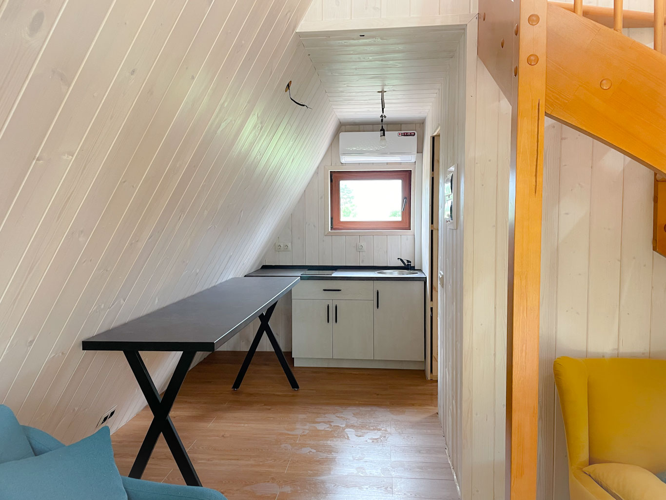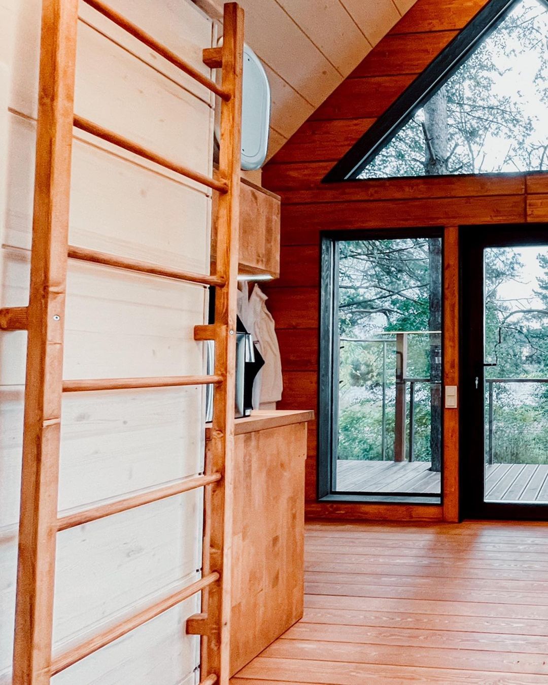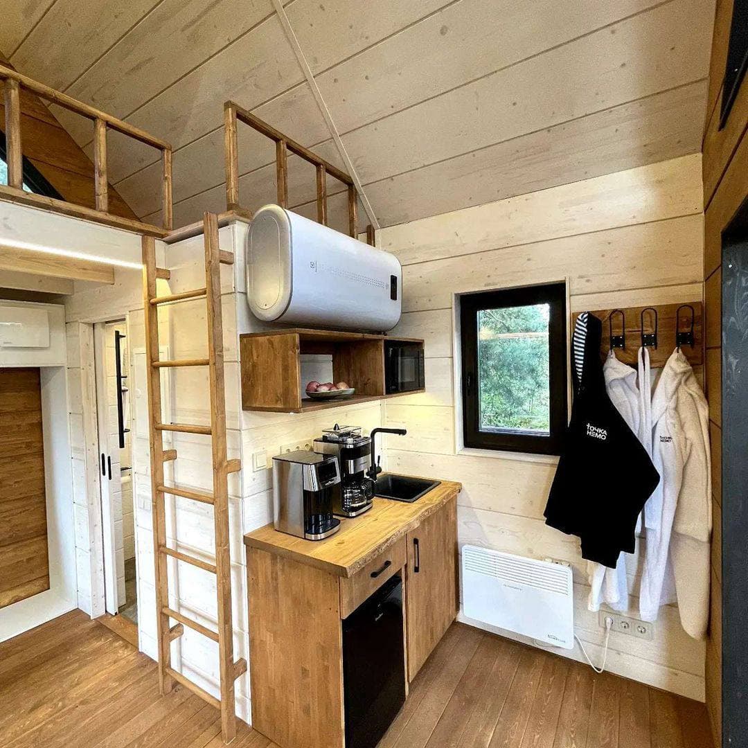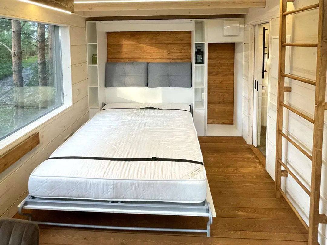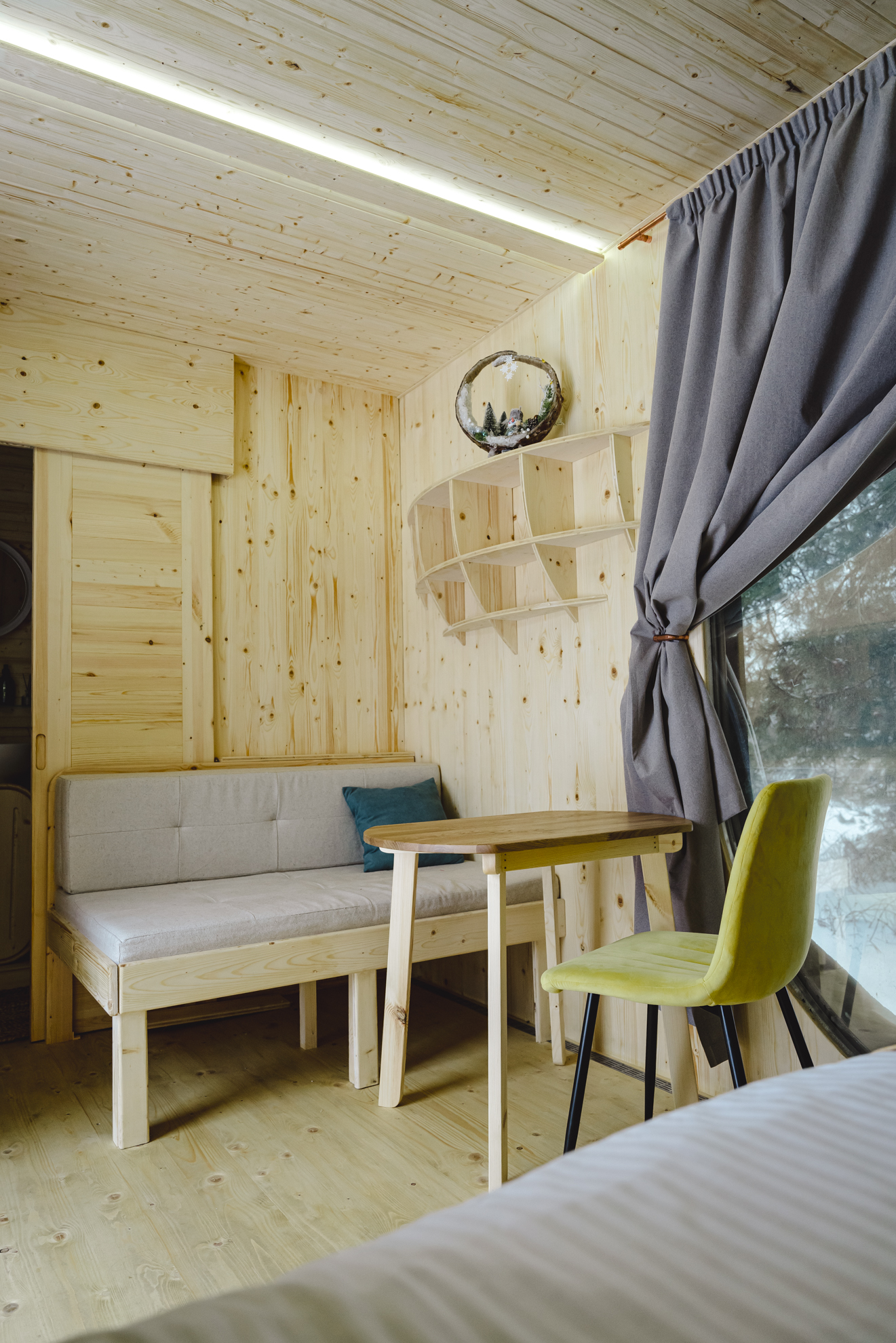 Это очень уютный экодомик, напоминающий нам телевизор, в котором каждый сантиметр пространства использован продуманно. Дом собран на каркасе из сосны, встроенная мебель сделана так же из этого дерева! Утеплитель — максимально экологичен — на основе льна. И он очень приятный тактильно. По тёплому полу так приятно ходить босиком, а ладонями ощущать приятную бархатистость дерева.