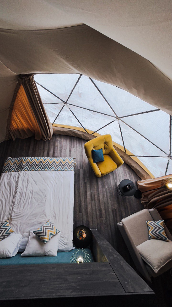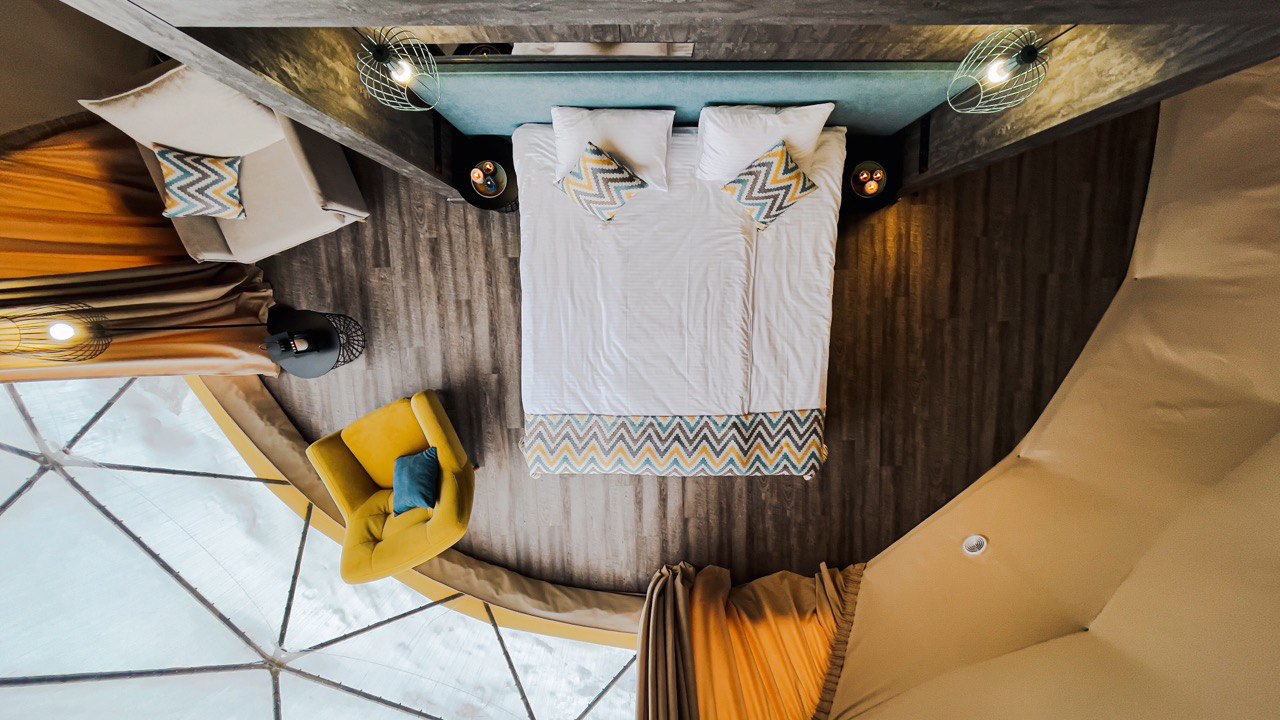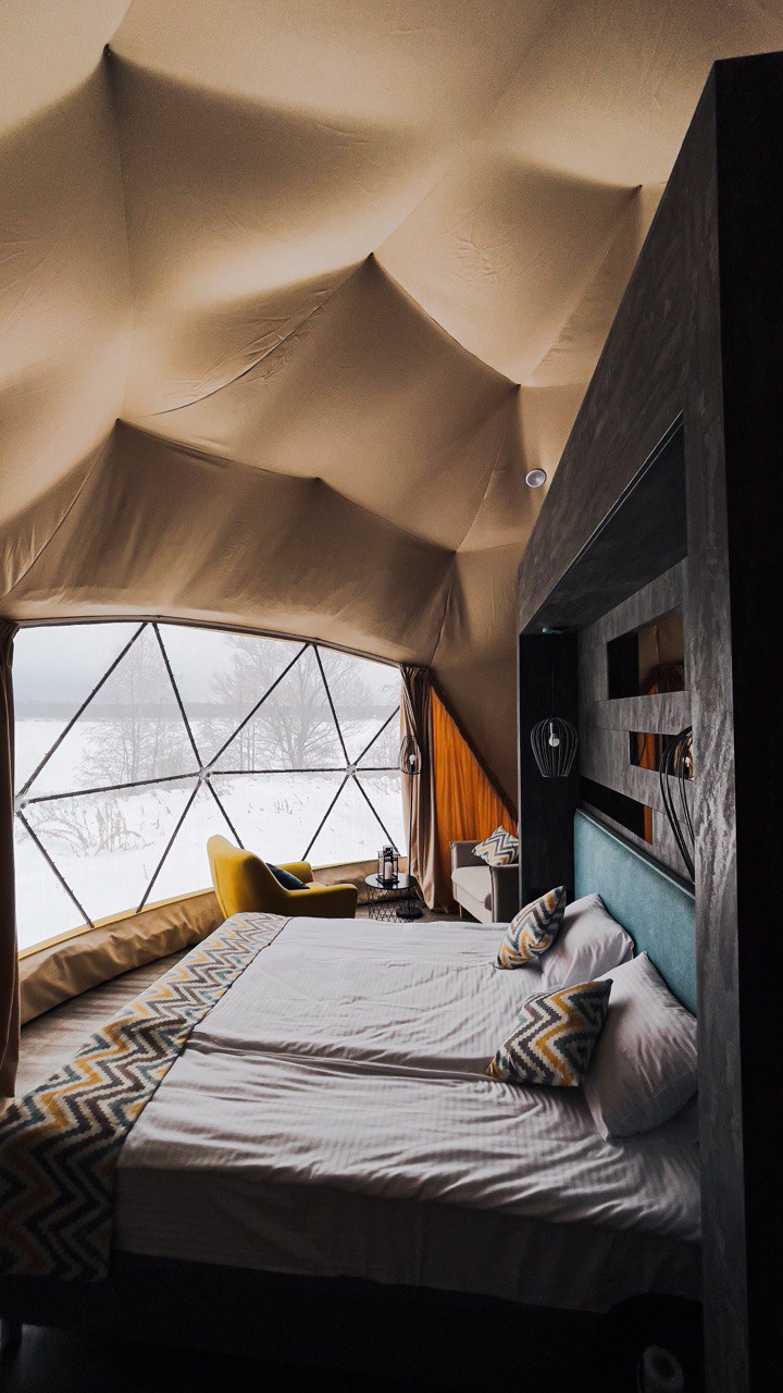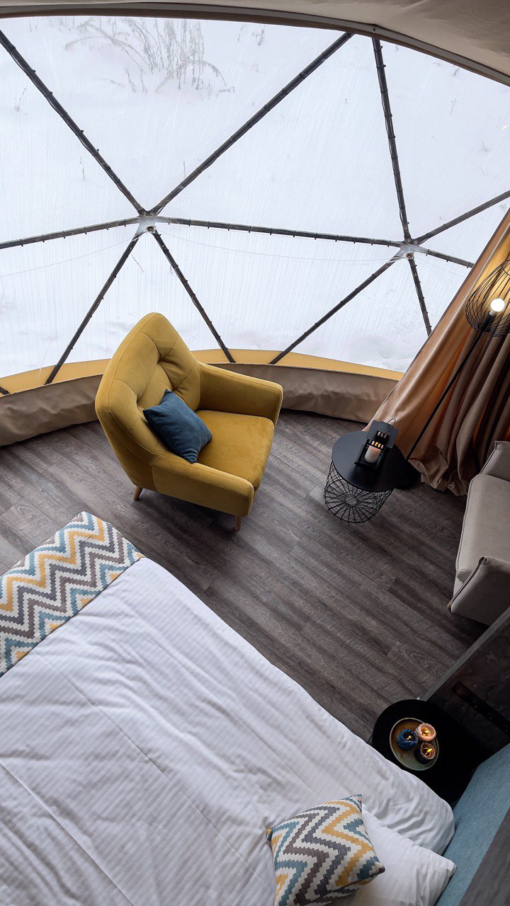 Снаружи это футуристичная конструкция, поражающая эргономичным дизайном и панорамными окнами, а внутри — уютная студия со всем необходимым, в которой вам будет также комфортно, как и в современном номере отеля. Площадь каждого купола — 38 кв.м, а высота — более 4 метров, что позволяет вместить до 5 гостей.