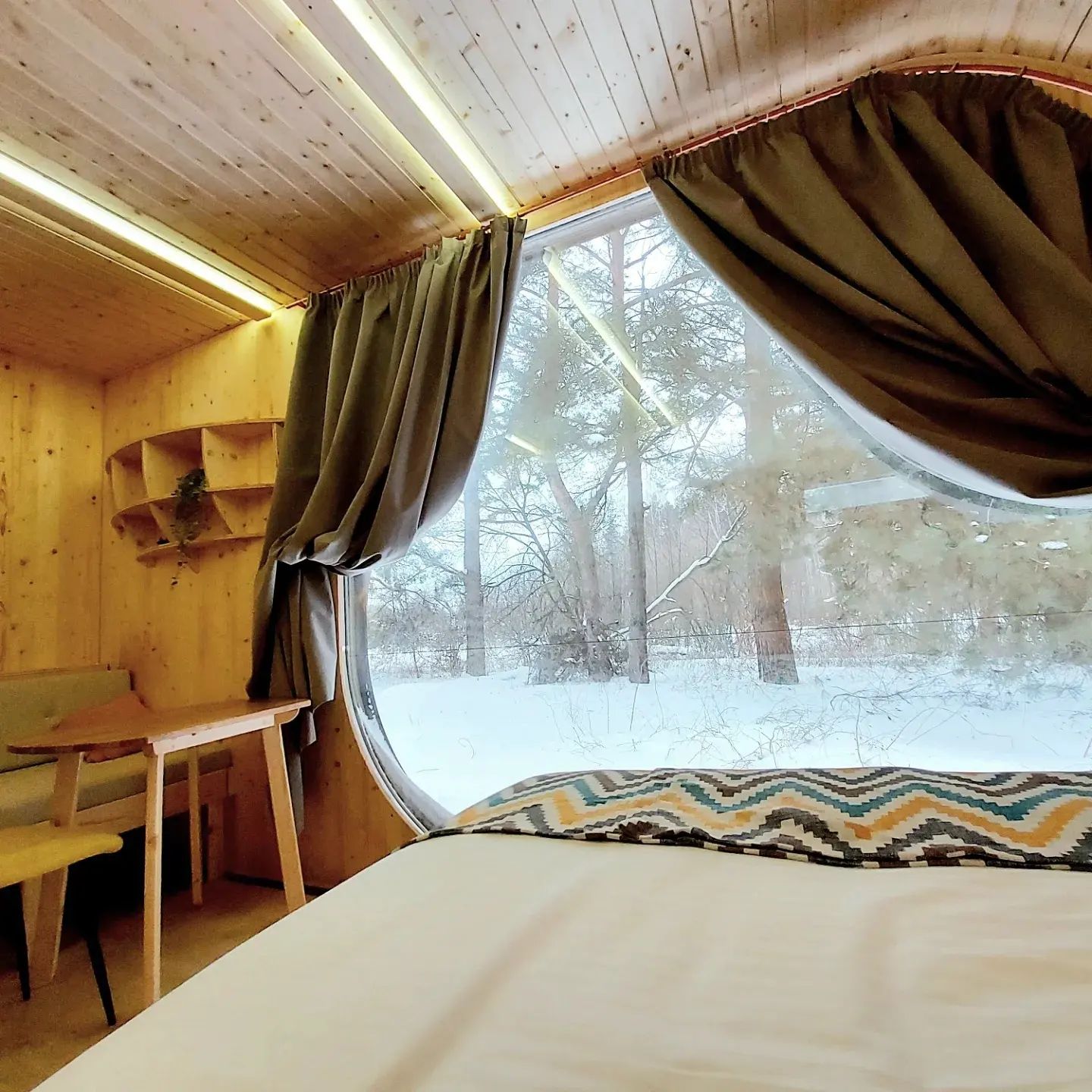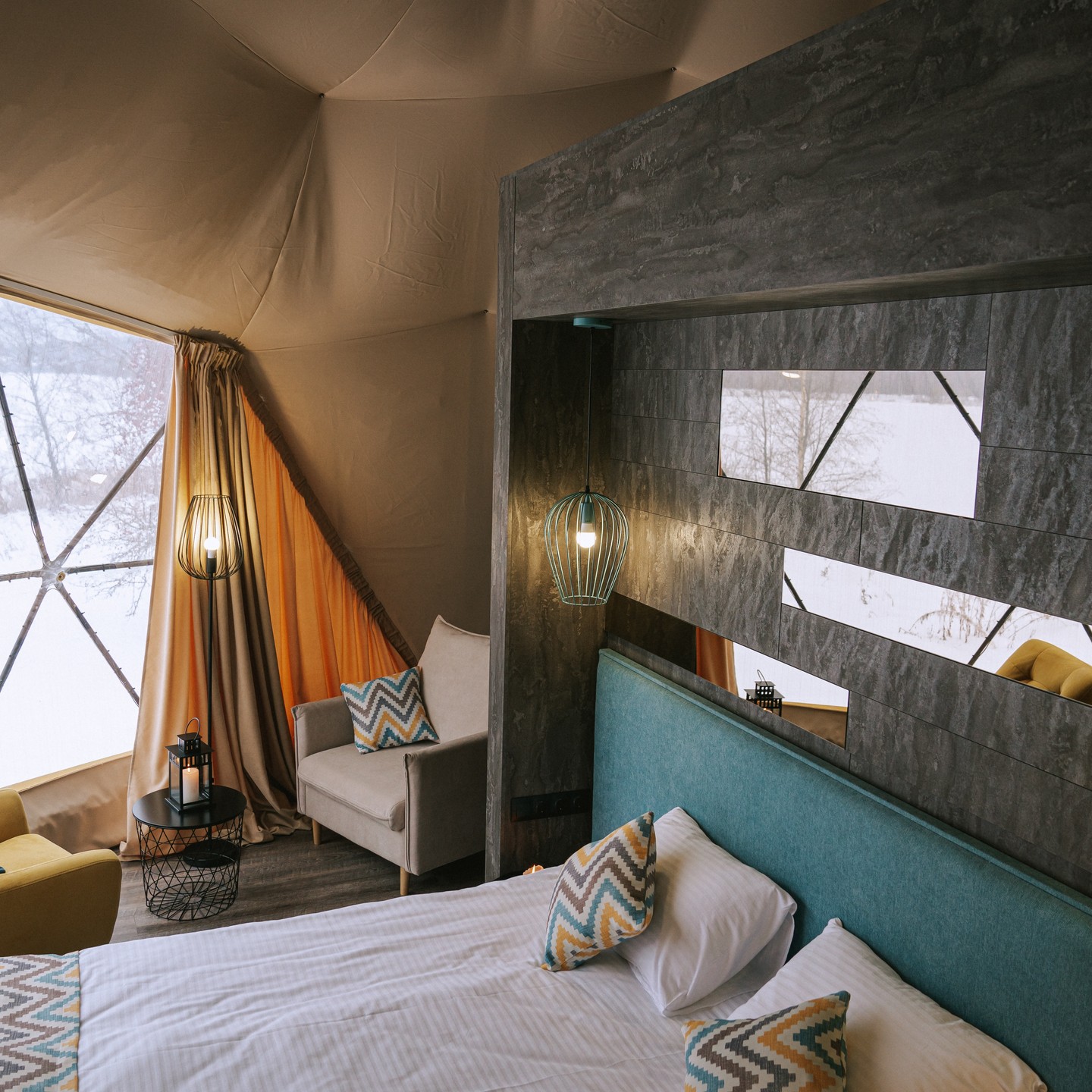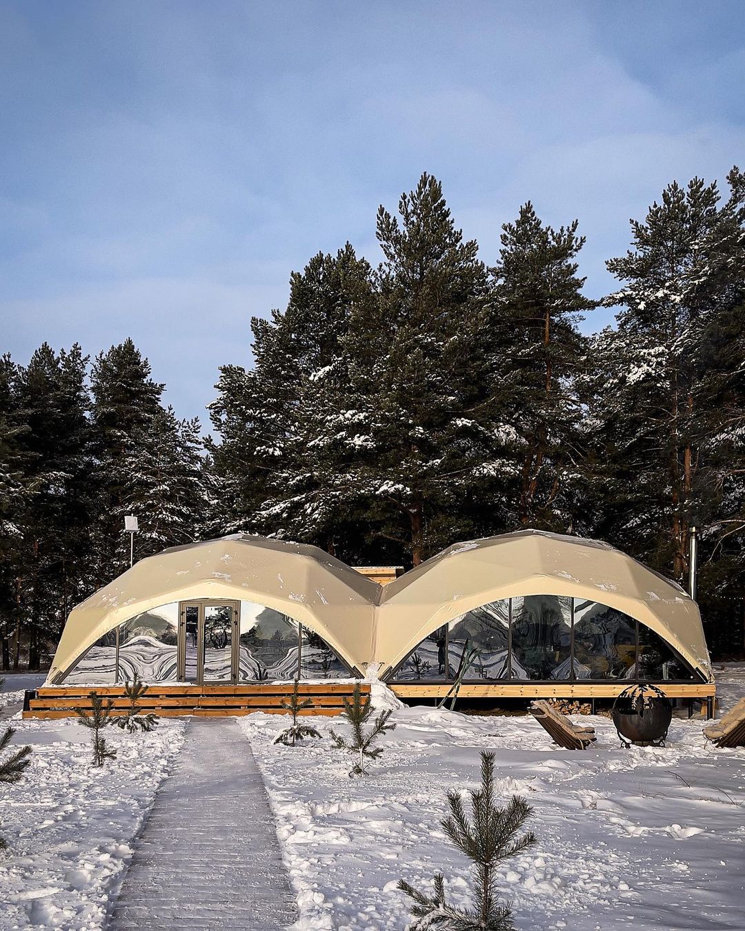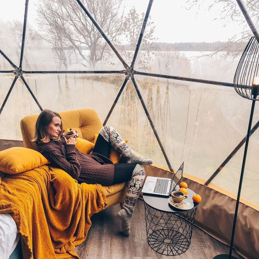 Снаружи это футуристичная конструкция, поражающая эргономичным дизайном и панорамными окнами, а внутри — уютная студия со всем необходимым, в которой вам будет также комфортно, как и в современном номере отеля. Площадь каждого купола — 38 кв.м, а высота — более 4 метров, что позволяет вместить до 5 гостей.