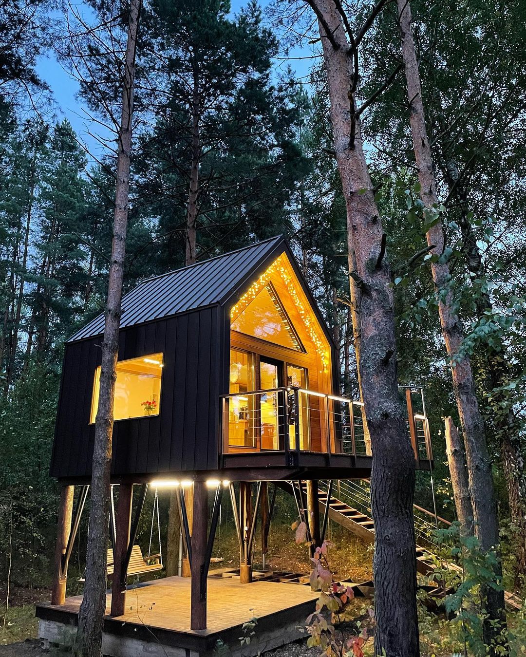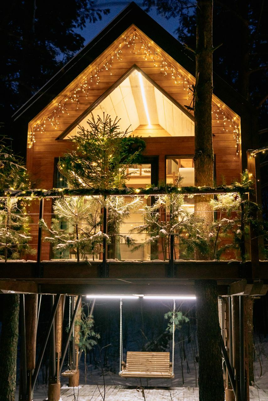 Размещение в комфортабельном и единственном в своем роде круглогодичном домике на дереве на высоте 4-х метров с огромными панорамными окнами с потрясающим видом на лес.