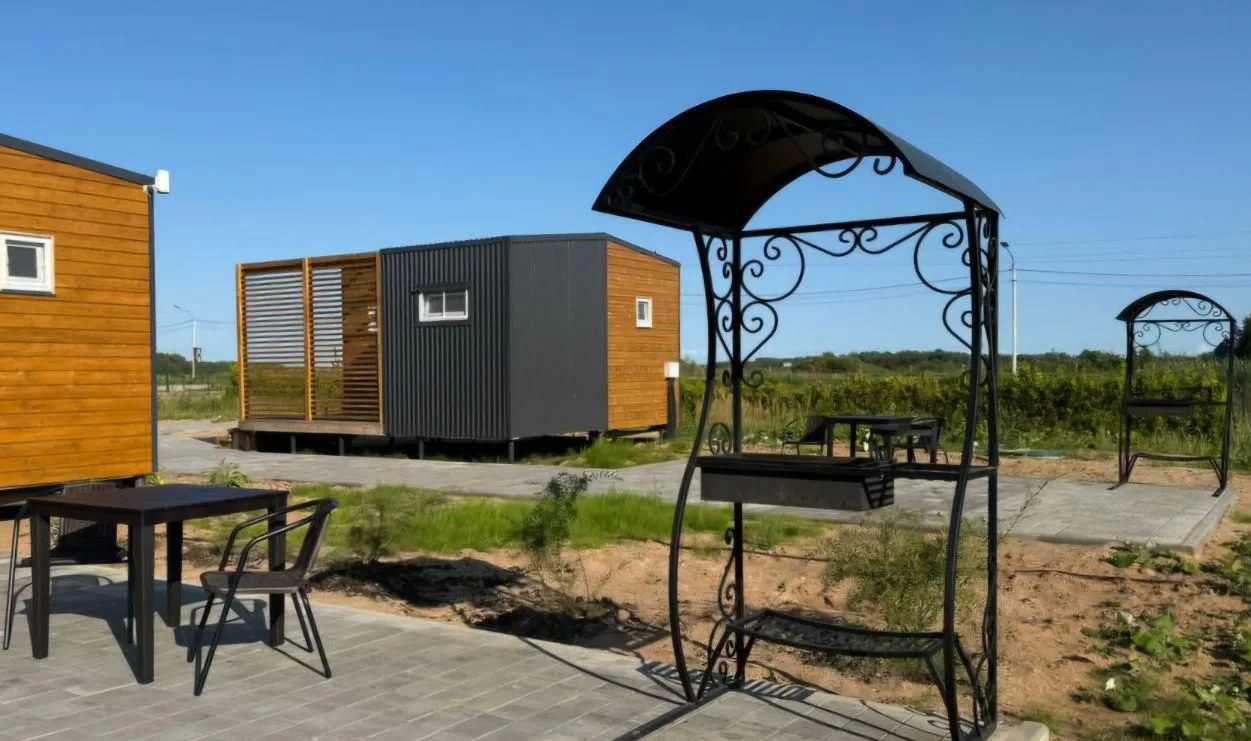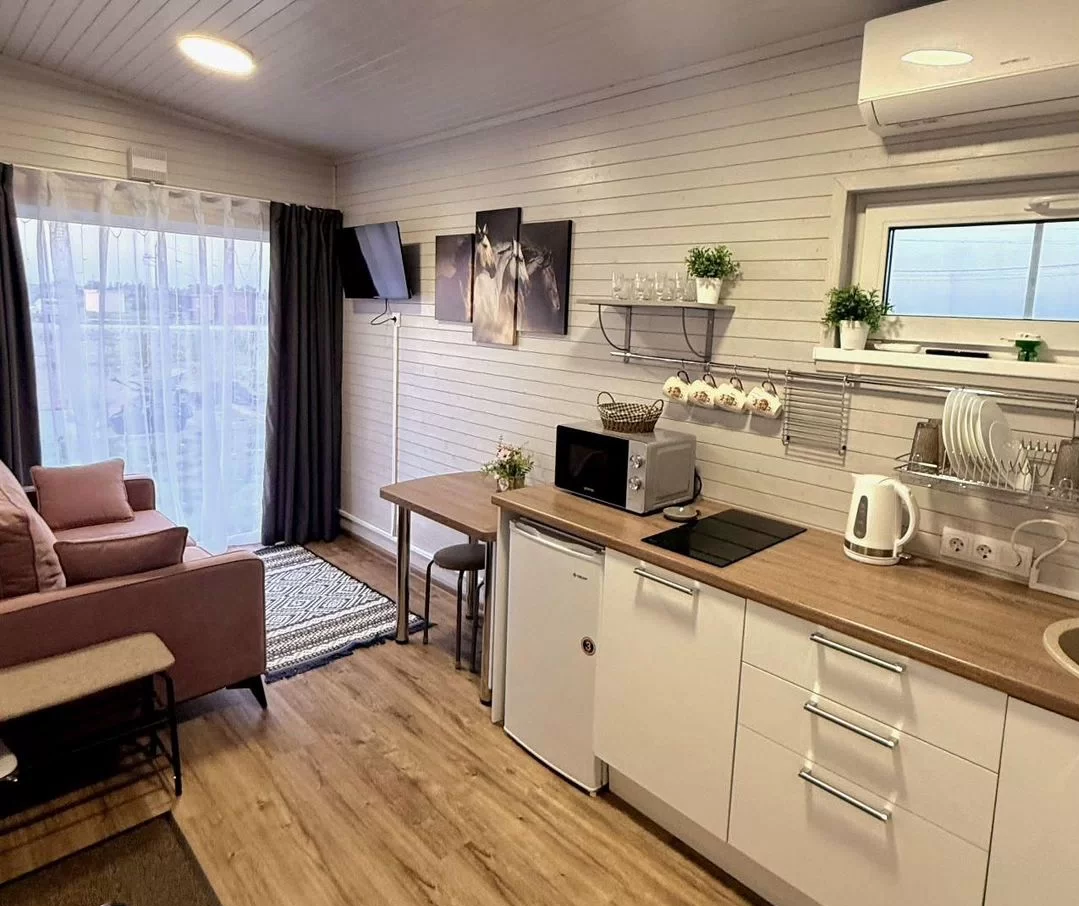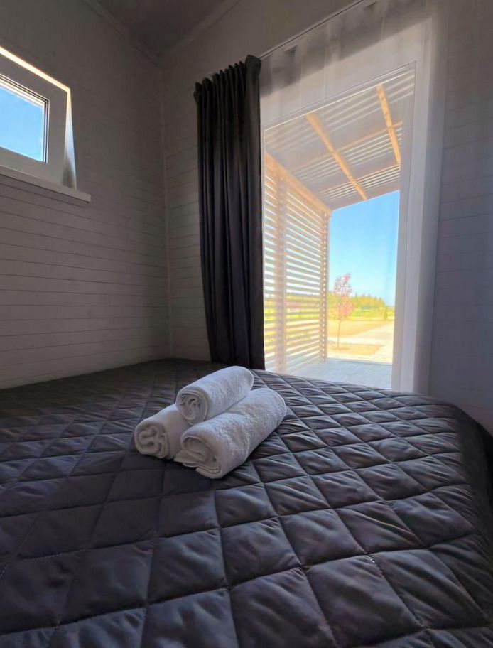 Гостям предлагаются уютные коттеджи площадью 23 кв. м. Домик рассчитан на 2 взрослых (двое детей могут разместиться на дополнительном месте — диване). Внутри — две отдельные комнаты: спальня и кухня-гостиная, а также совмещенный санузел с душем. В каждом доме есть всё необходимое для комфортного отдыха.