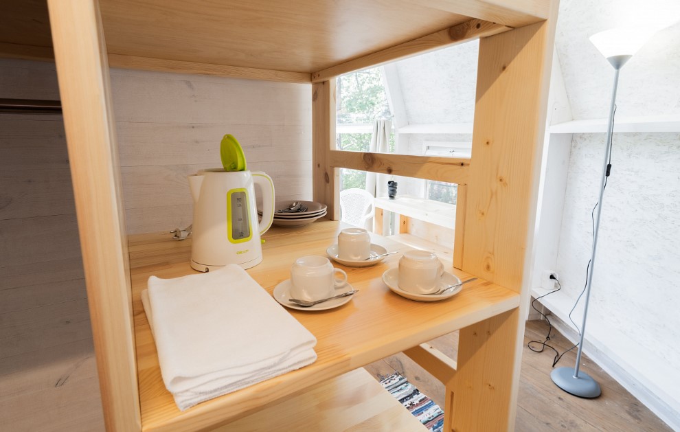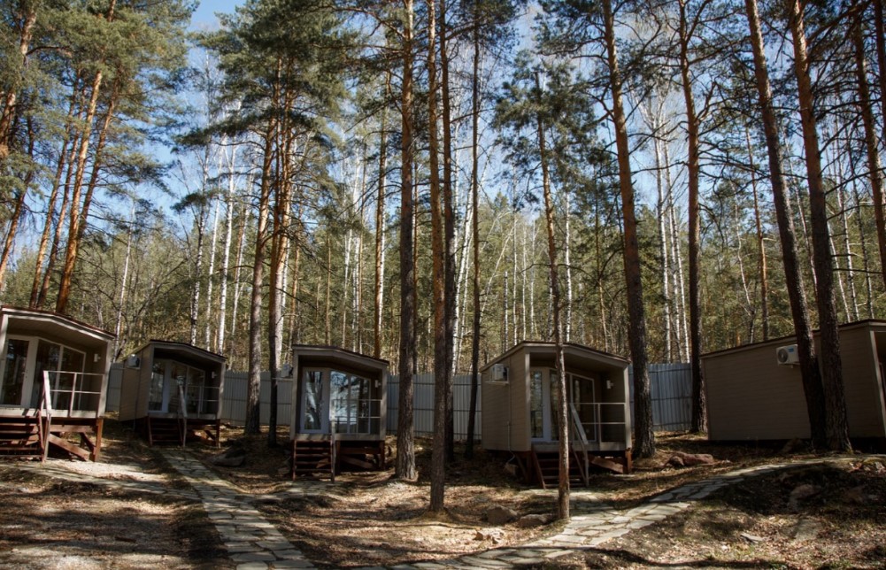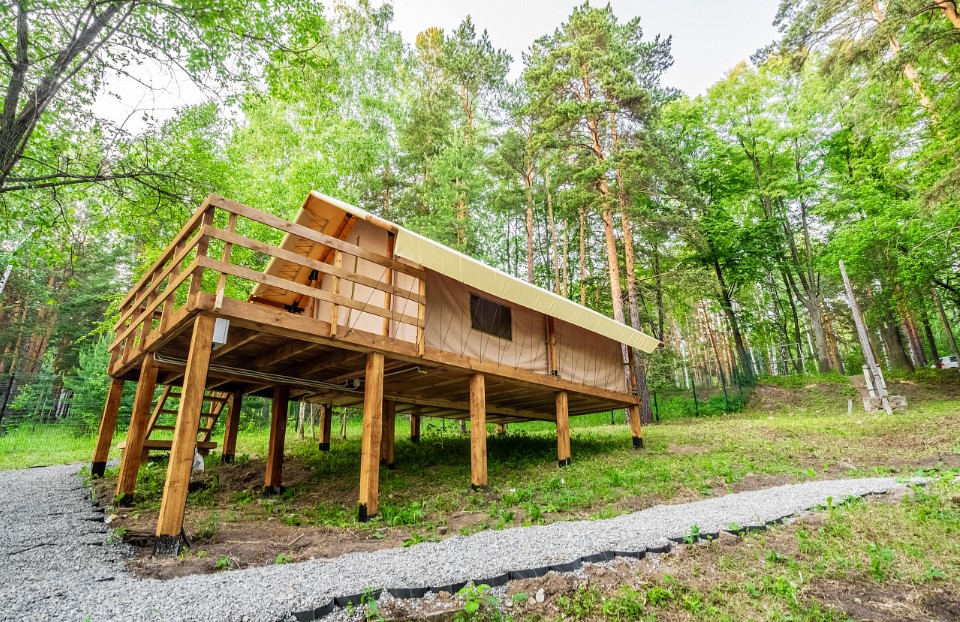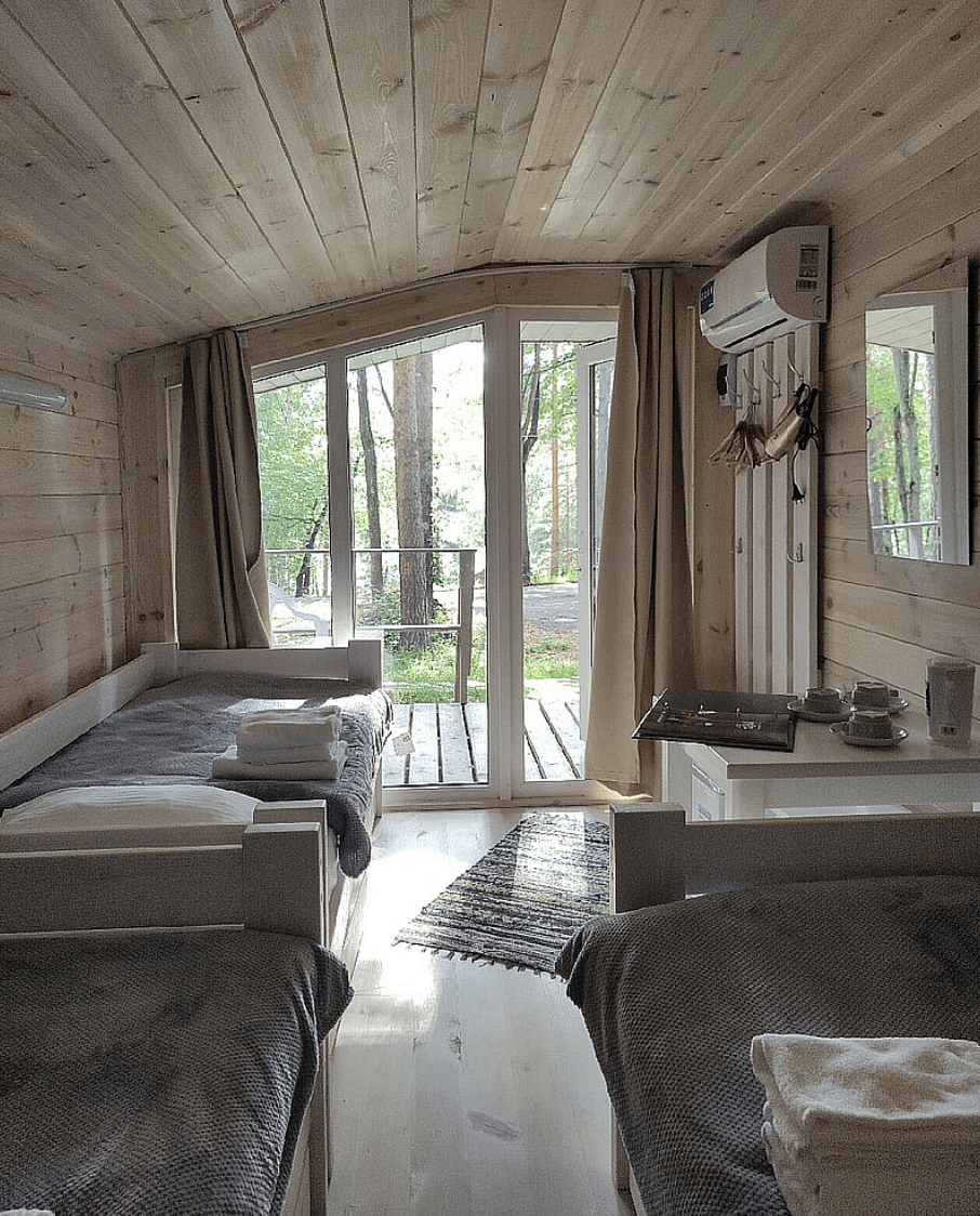 Здесь есть удобные односпальные кровати, кондиционер и холодильник. Индивидуальный санузел с горячей водой находится буквально в паре шагов от домика и запирается на ключ. А на веранде с видом на лес и озеро Теренкуль очень приятно проводить время, ведь глэмпинги находятся в удалении от основных маршрутов курорта.