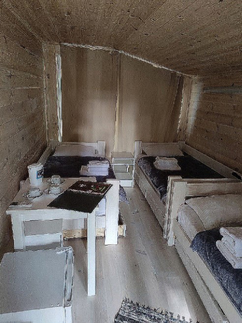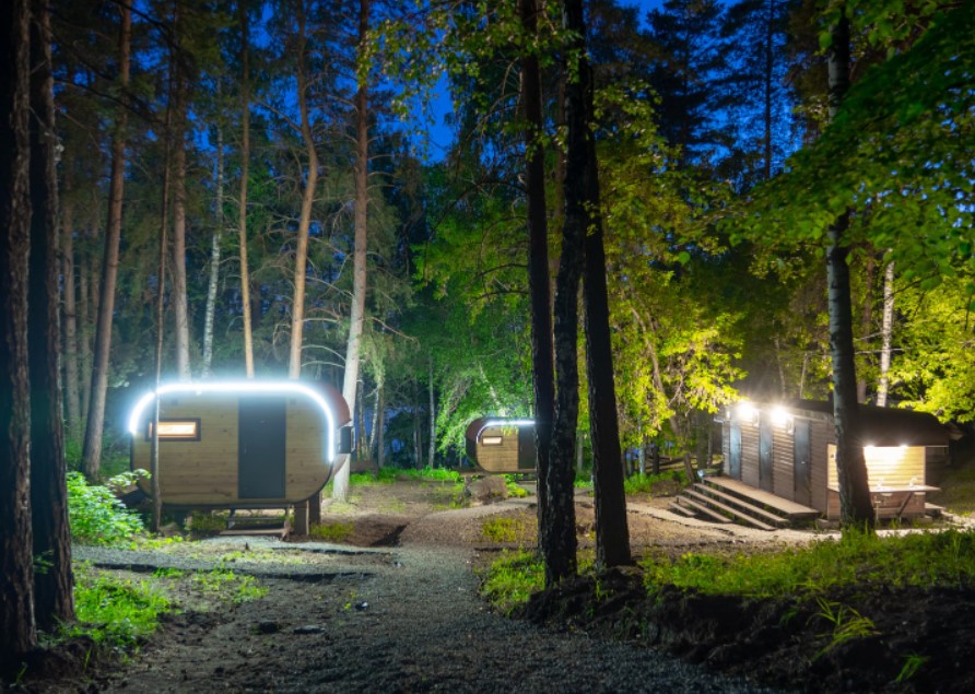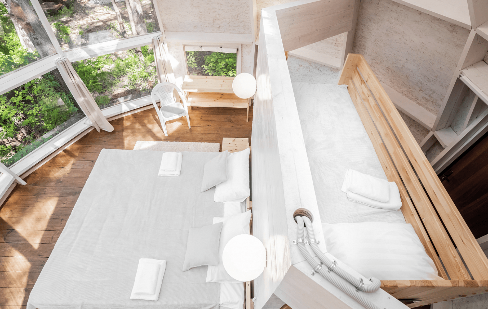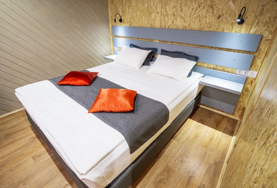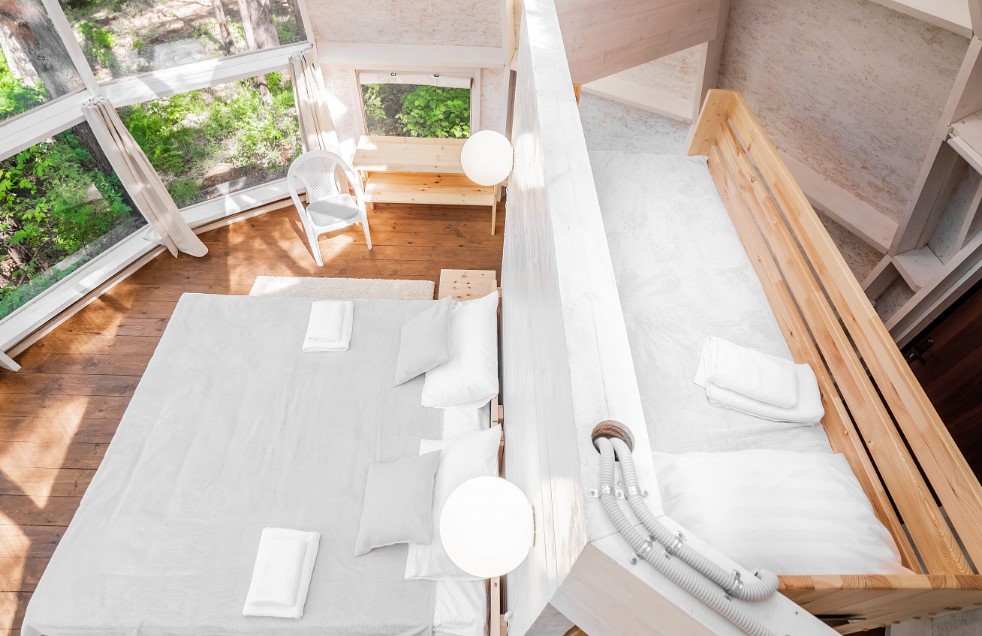 Здесь есть удобные односпальные кровати, кондиционер и холодильник. Индивидуальный санузел с горячей водой находится буквально в паре шагов от домика и запирается на ключ. А на веранде с видом на лес и озеро Теренкуль очень приятно проводить время, ведь глэмпинги находятся в удалении от основных маршрутов курорта.