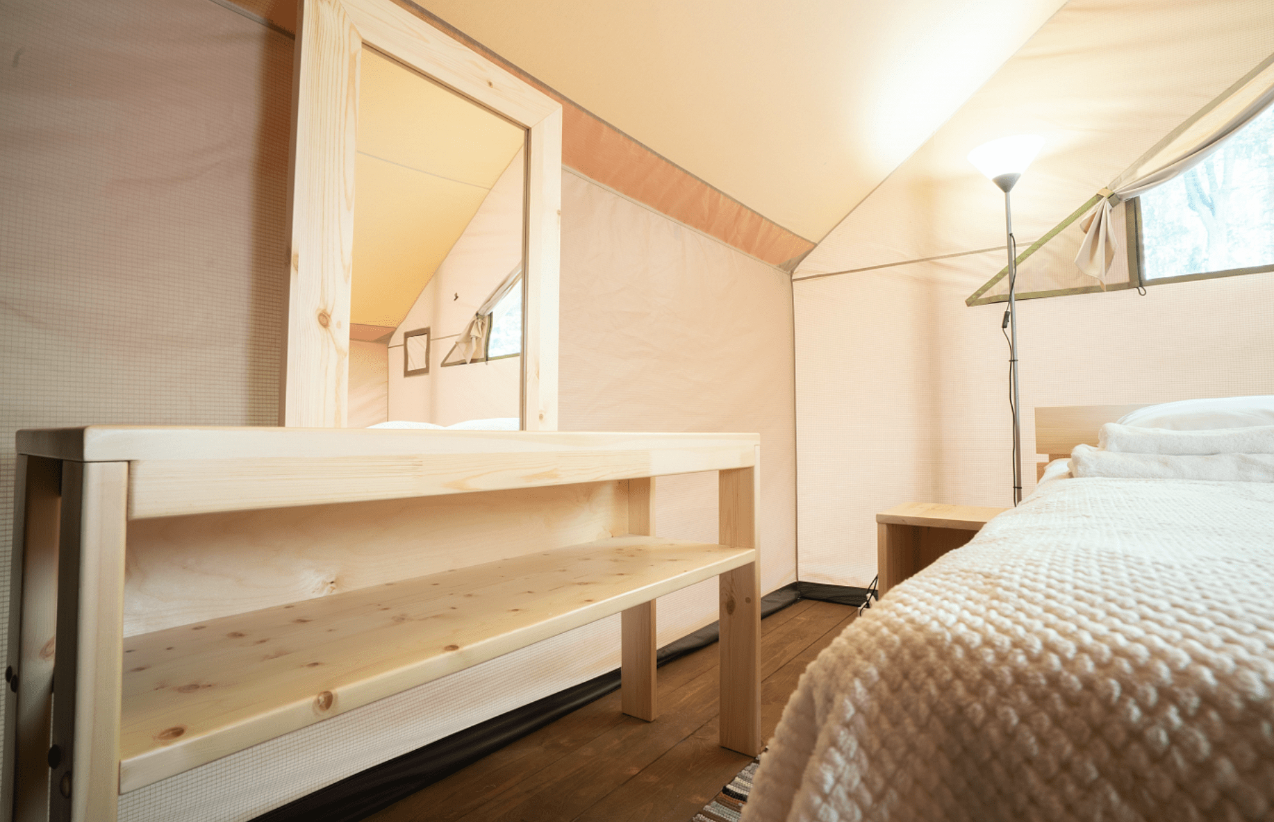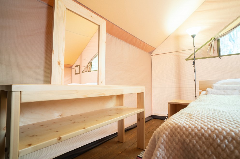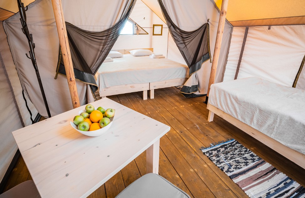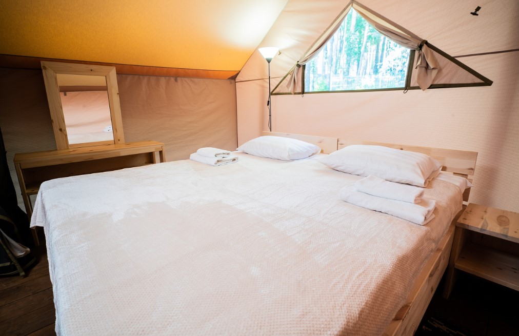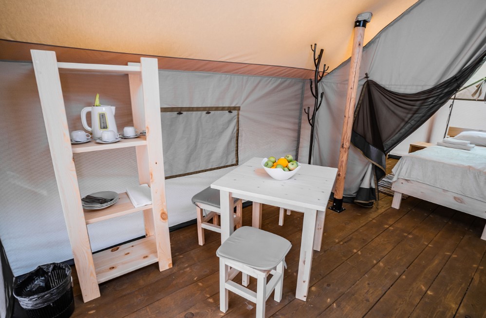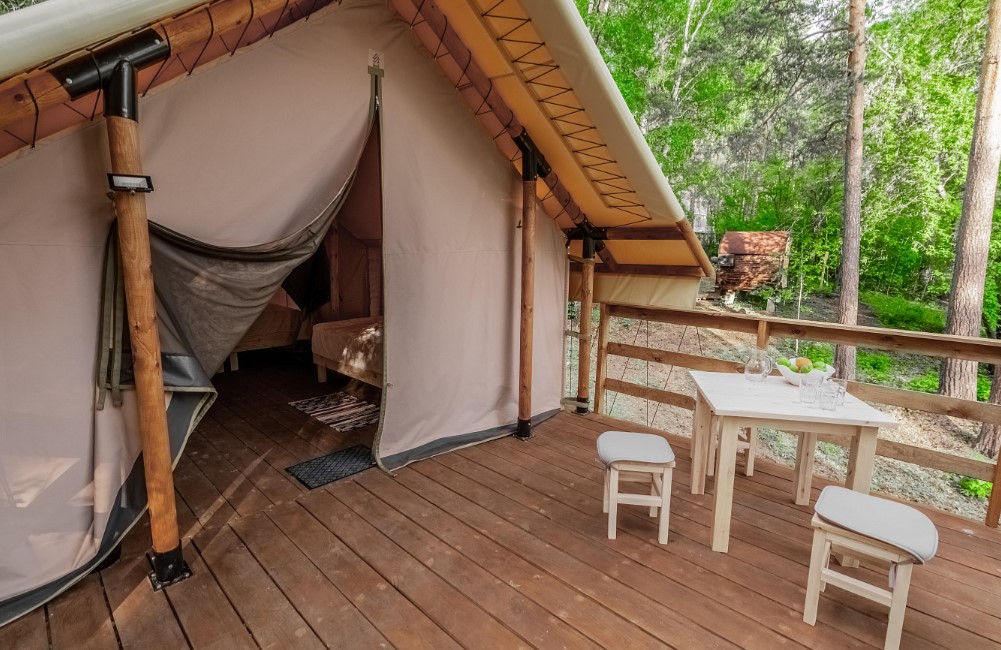 Сафари-тент - место для максимально комфортного отдыха на природе. Это не просто палатка, где можно укрыться от непогоды или переночевать. Здесь вы с удовольствием проведете время всей семьей! Удобные кровати, электричество и интернет, просторная терраса, свежий воздух и вековые сосны на расстоянии вытянутой руки. Кондиционера здесь нет, прохладной ночью можно согреться под электроодеялом.