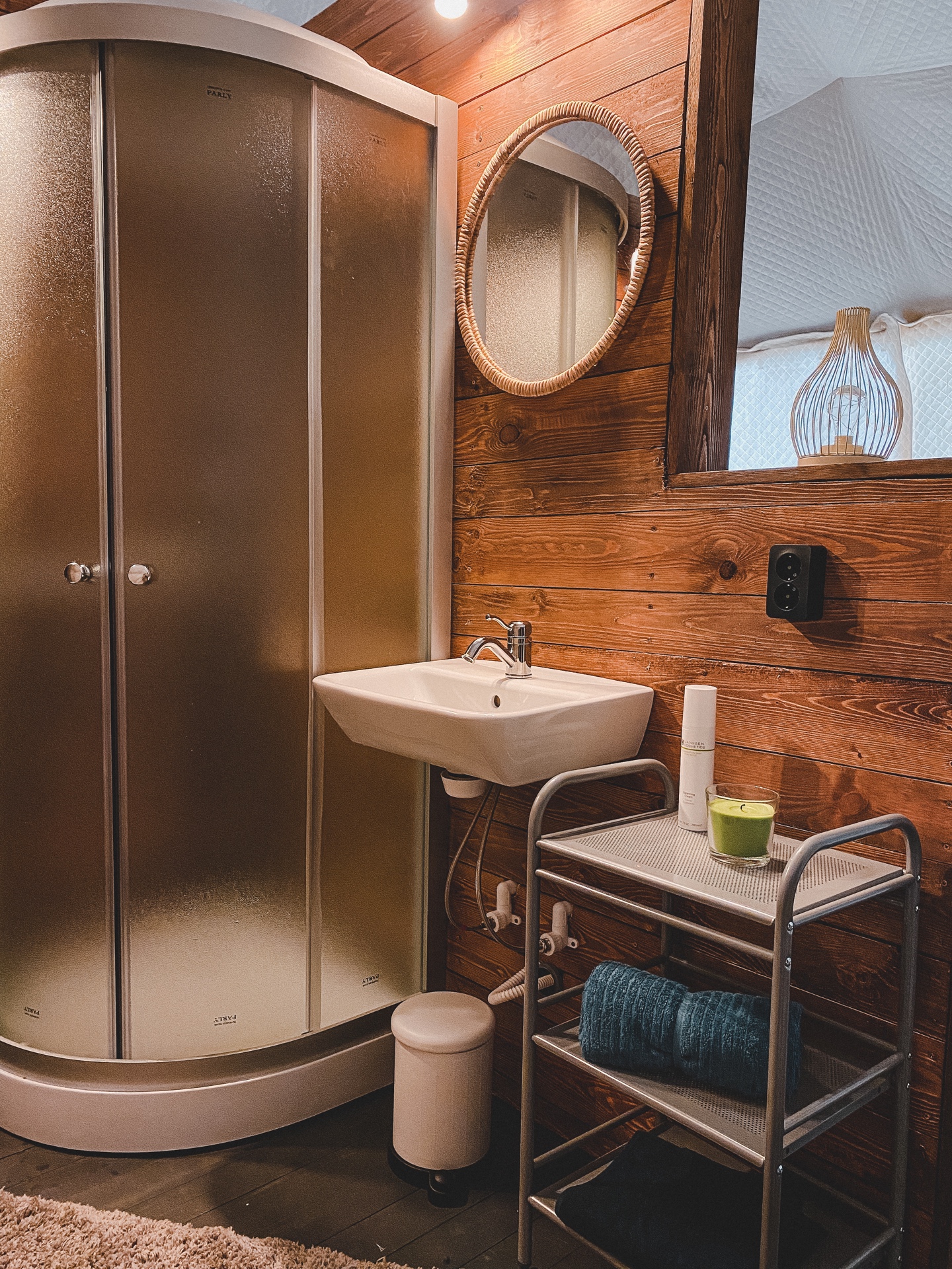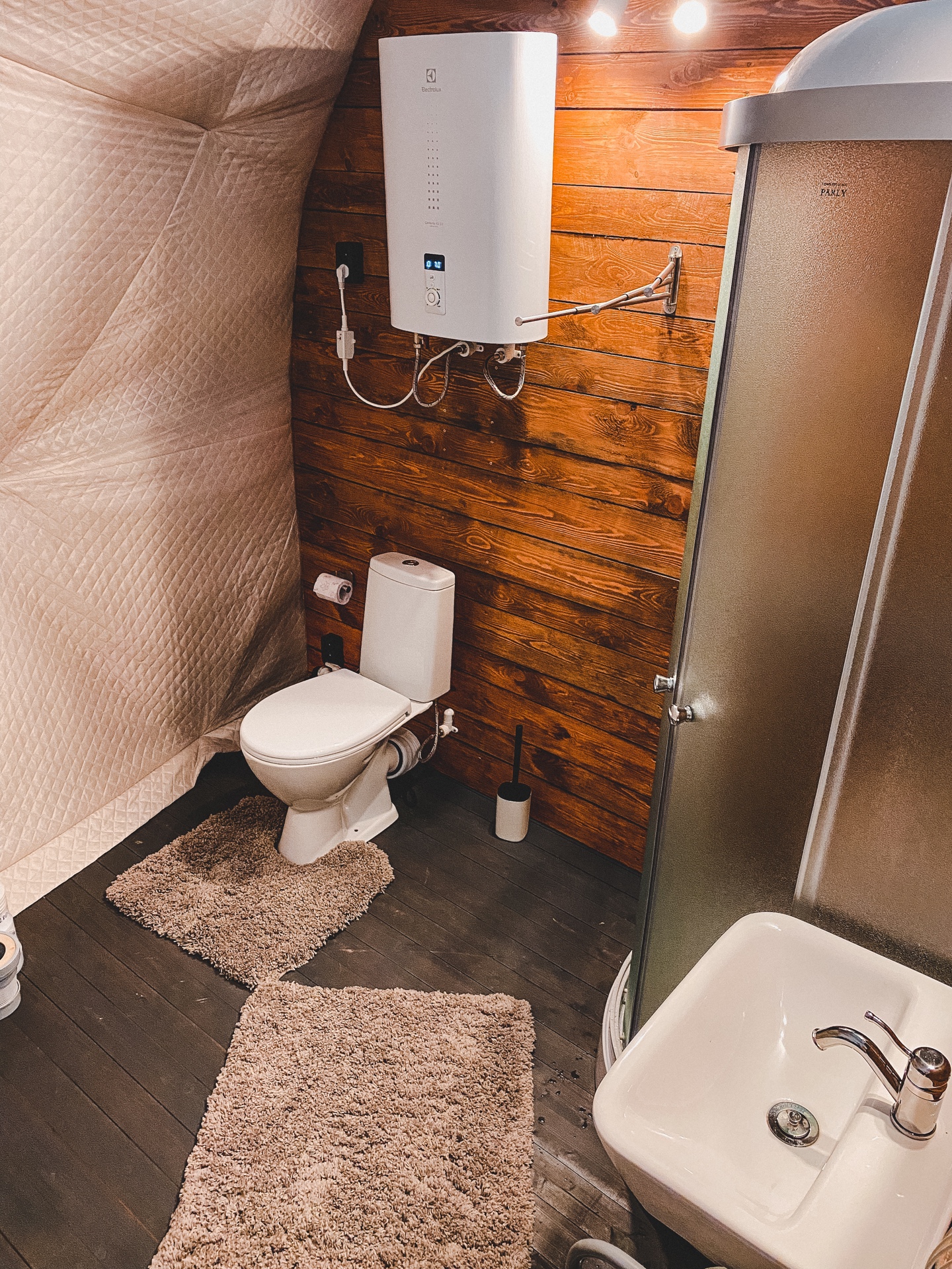 — санузел с душевой: туалет, душевая кабина, раковина, бойлер, зеркало, набор полотенец, туалетная бумага;