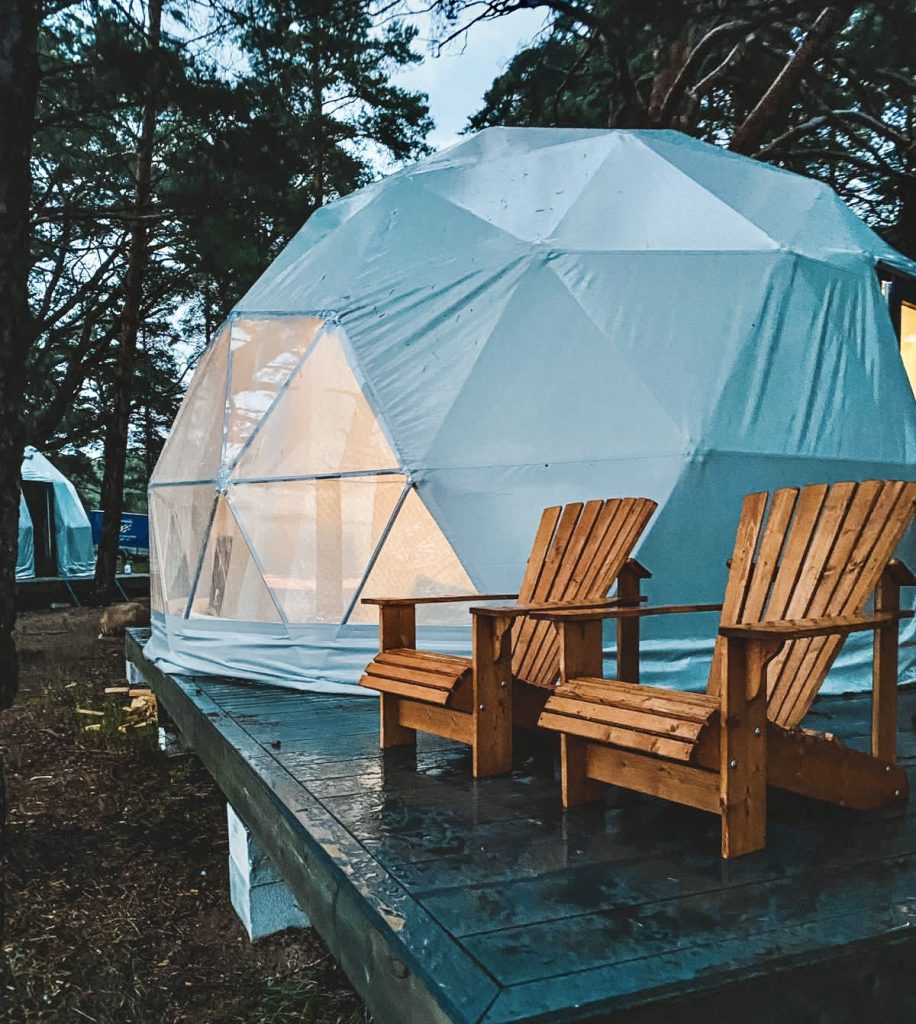 В нашем глэмпинге имеется несколько костровых зон, где можно разводить костры. Они оборудованы удобными стульями адирондак и столами для большой компании!
