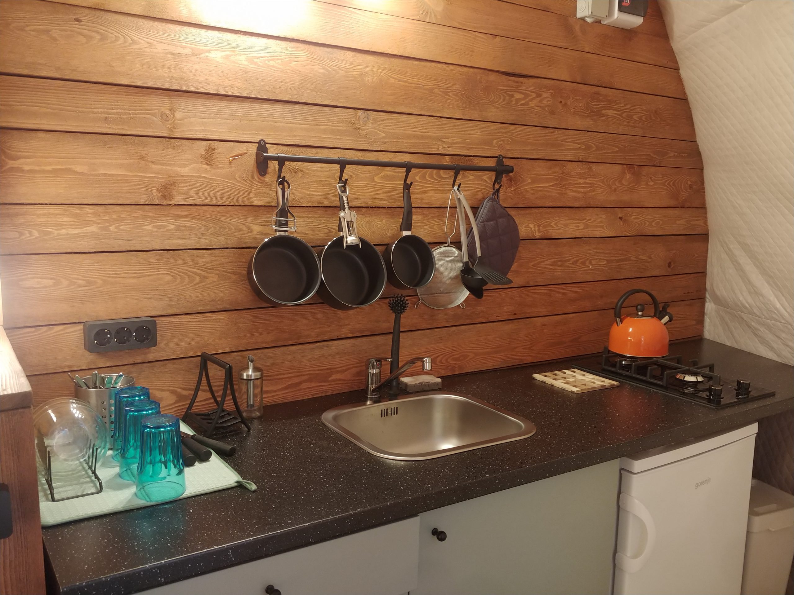 — мини-кухня с раковиной и набором посуды на 3-х человек (включая для приготовления пищи):