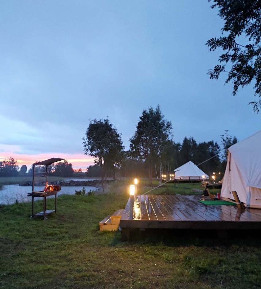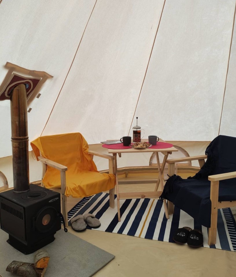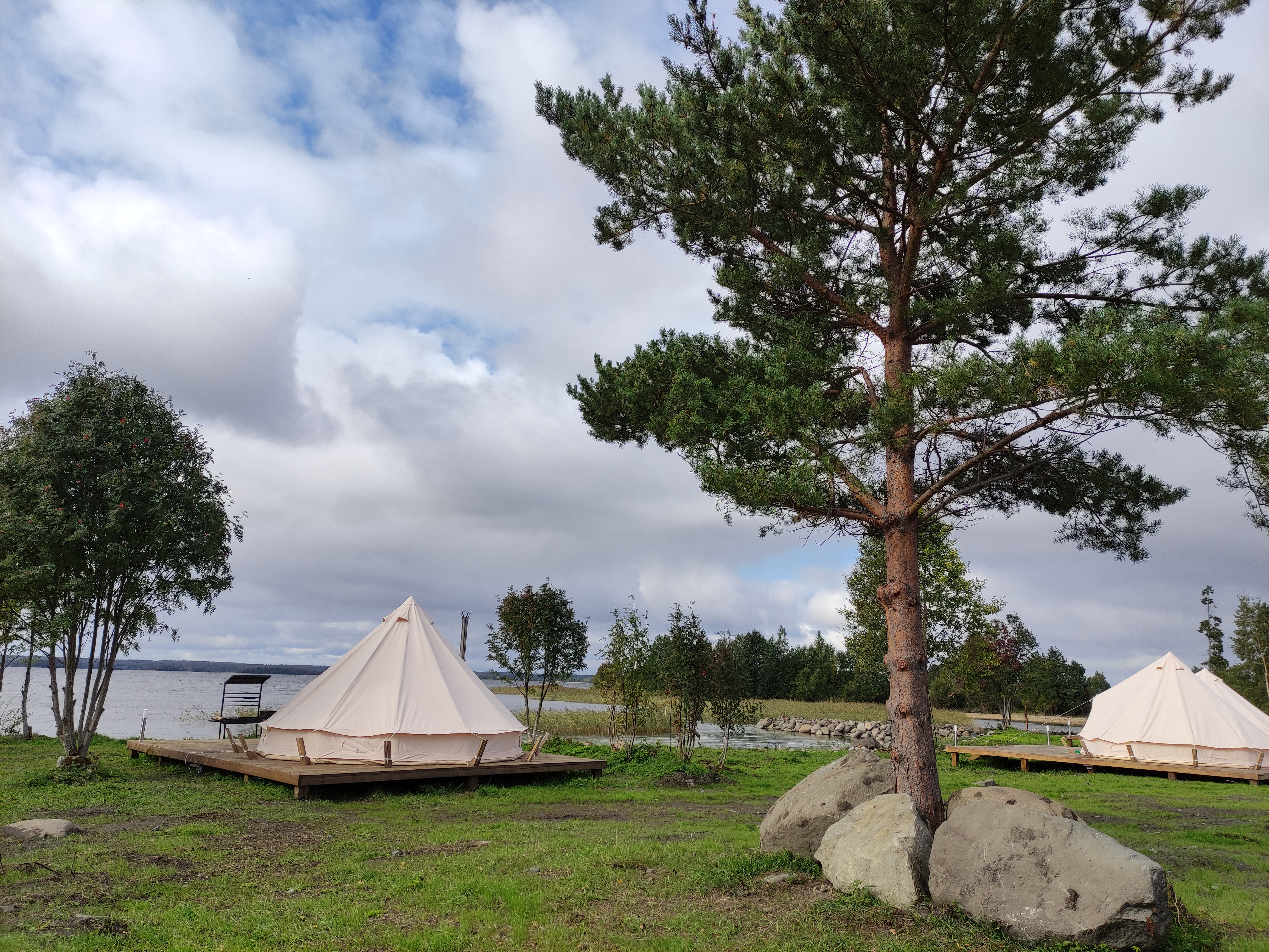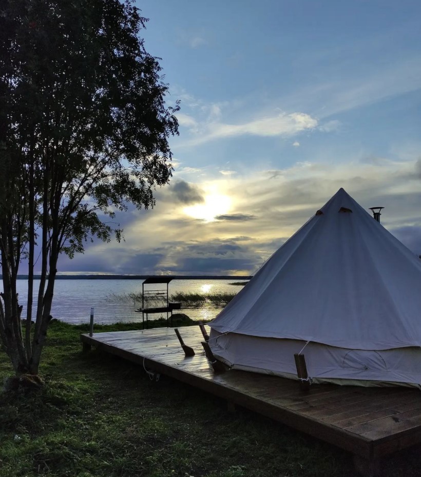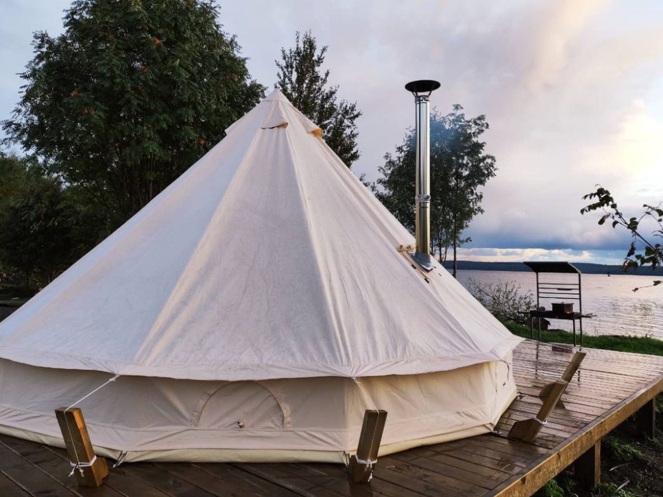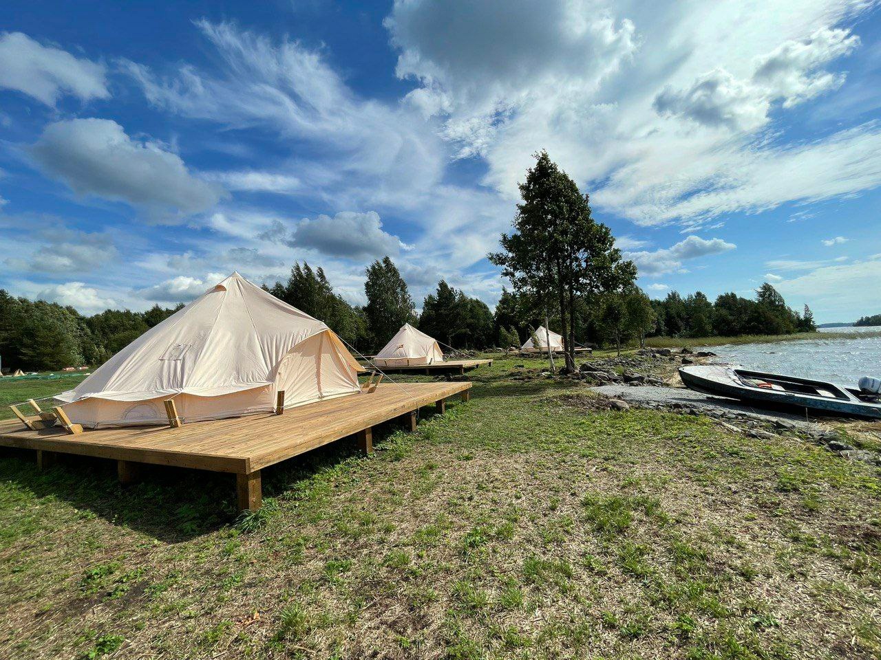 - 10 комфортных шатров (площадью 18М2) на уединенном берегу пляжа Онежского озера. Каждый шатер имеет возможность размещения до 3-х человек (2-х спальная кровать и кресло-кровать). При необходимости предоставляется детская кровать-манеж.