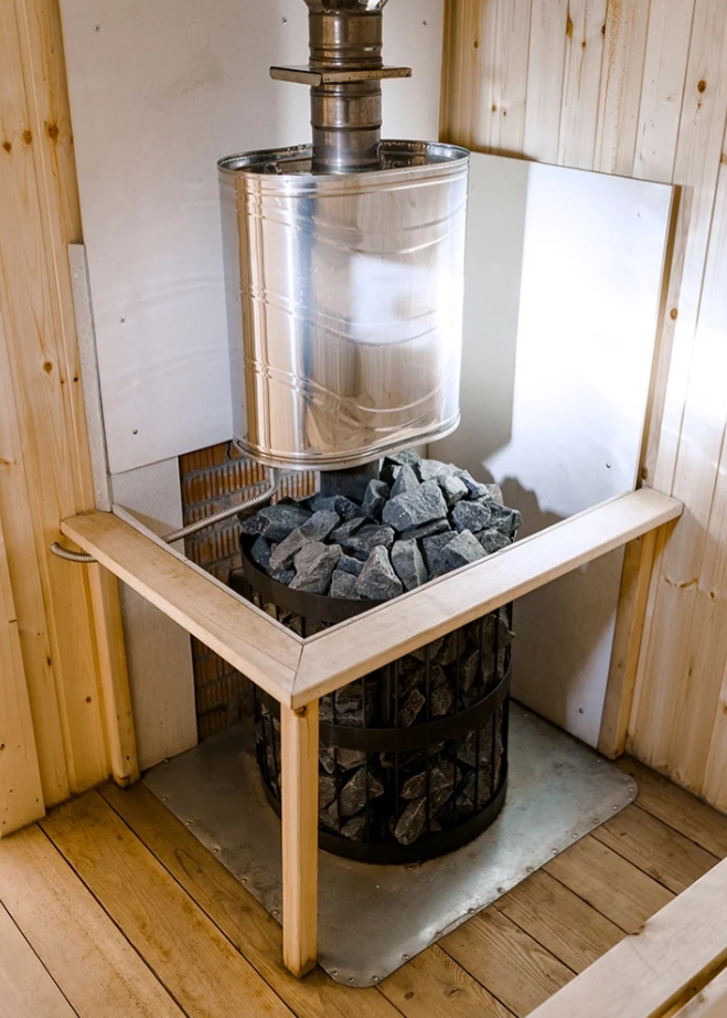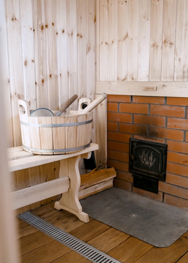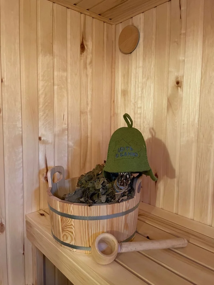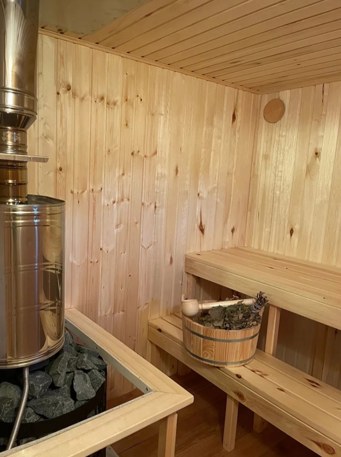 На территории виллы расположена банька. В меру жаркая, уютная, мягкая, с чаем и возможностью нырнуть в озеро или поваляться в снегу.