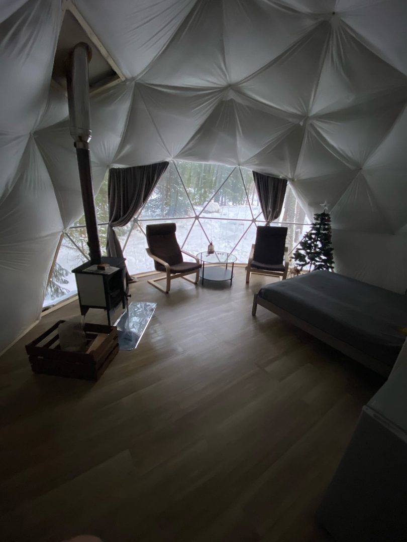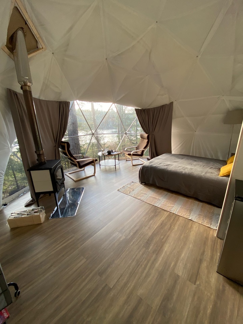 Внутри две удобные нижние кровати или одна большая для пар и дополнительное спальное место наверху, прикроватный столик, два кресла и журнальный стол у панорамного окна с видом на лес и озеро. Также шкаф для одежды, розетки, биотуалет, камин и раковина для умывания. Гостям предоставляется два полотенца.