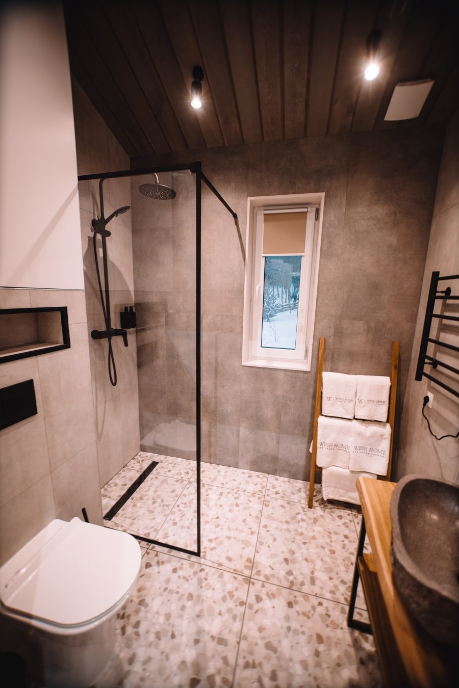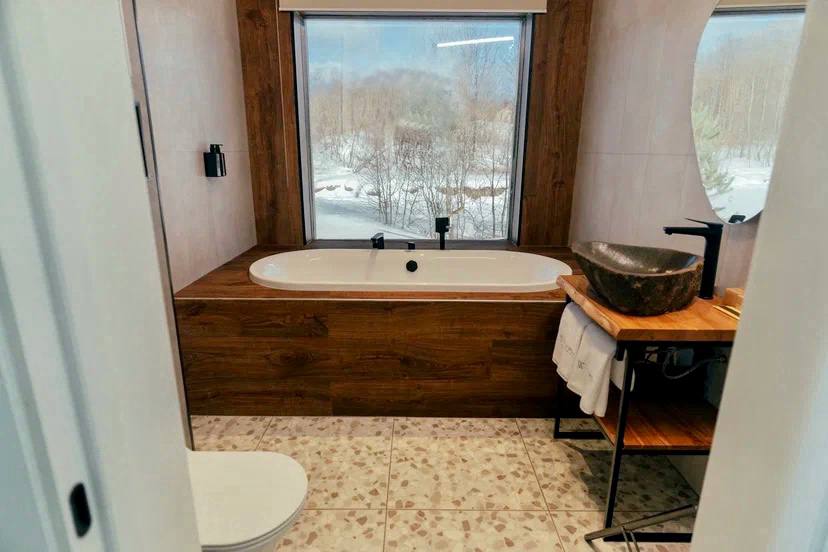Светлый лодж с ванной с панорамными окнами, террасой, мангальной зоной на свежем воздухе – для комфортного размещения от 2 до 4 гостей.