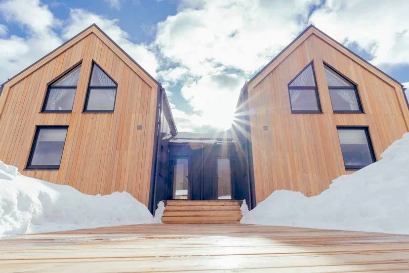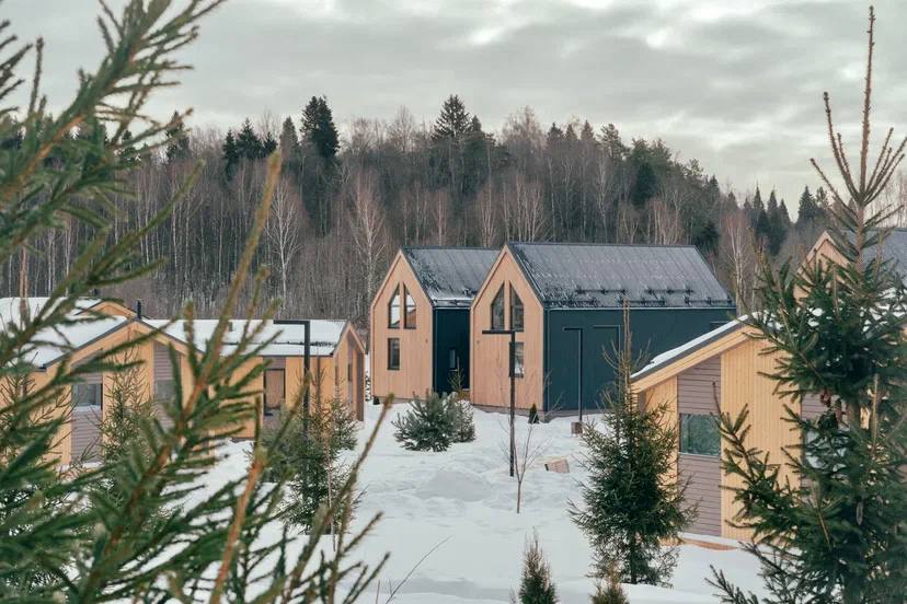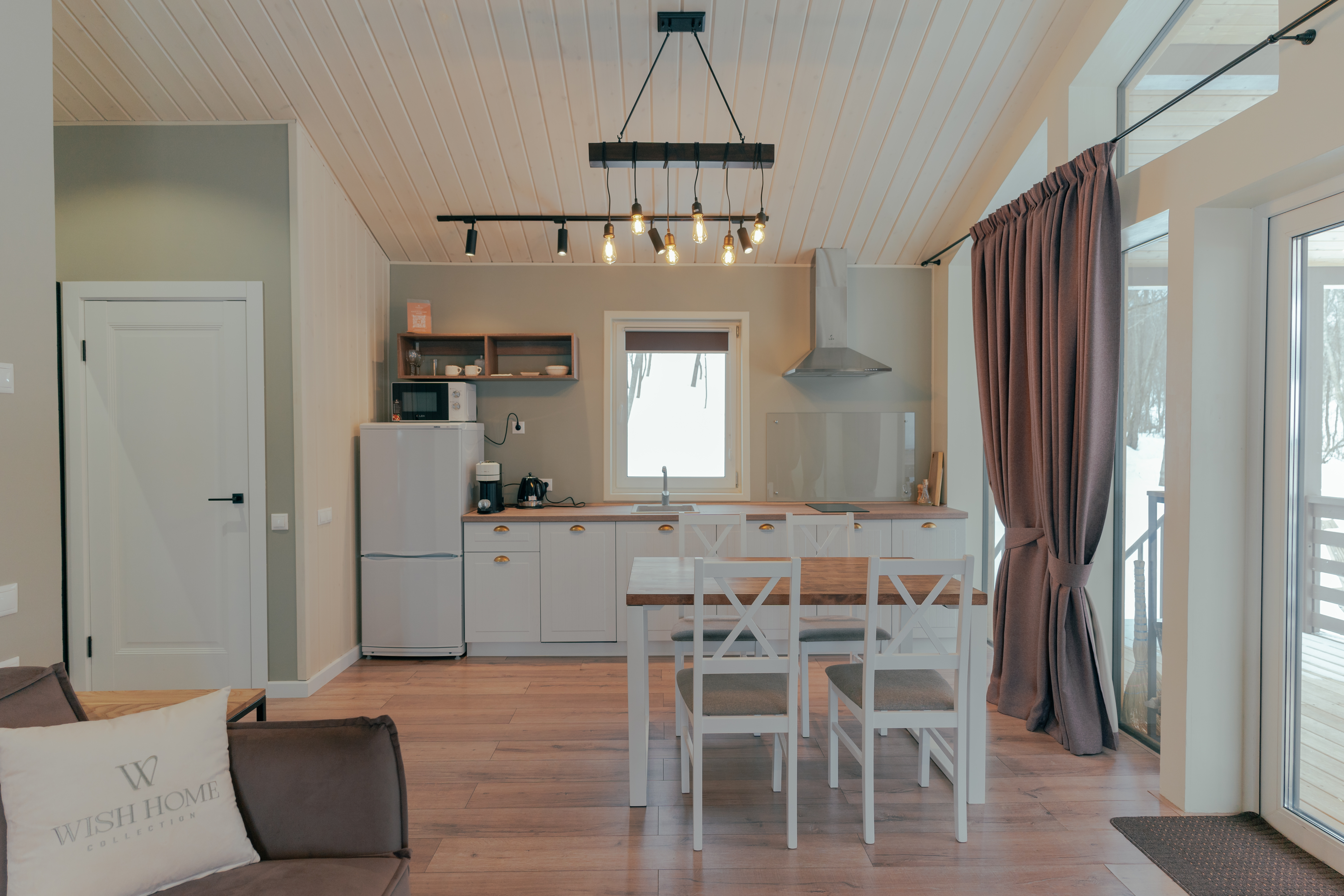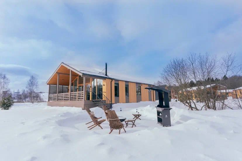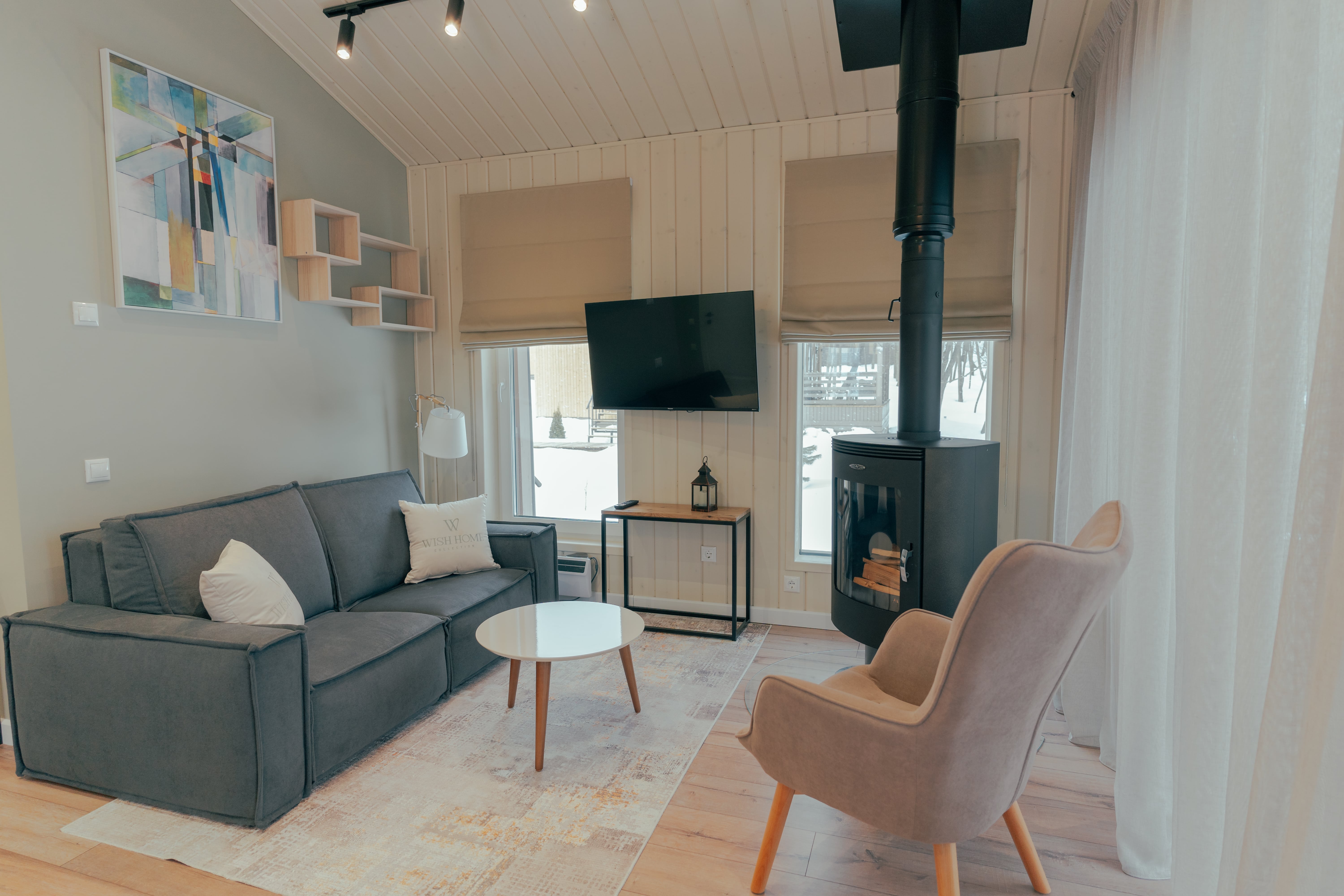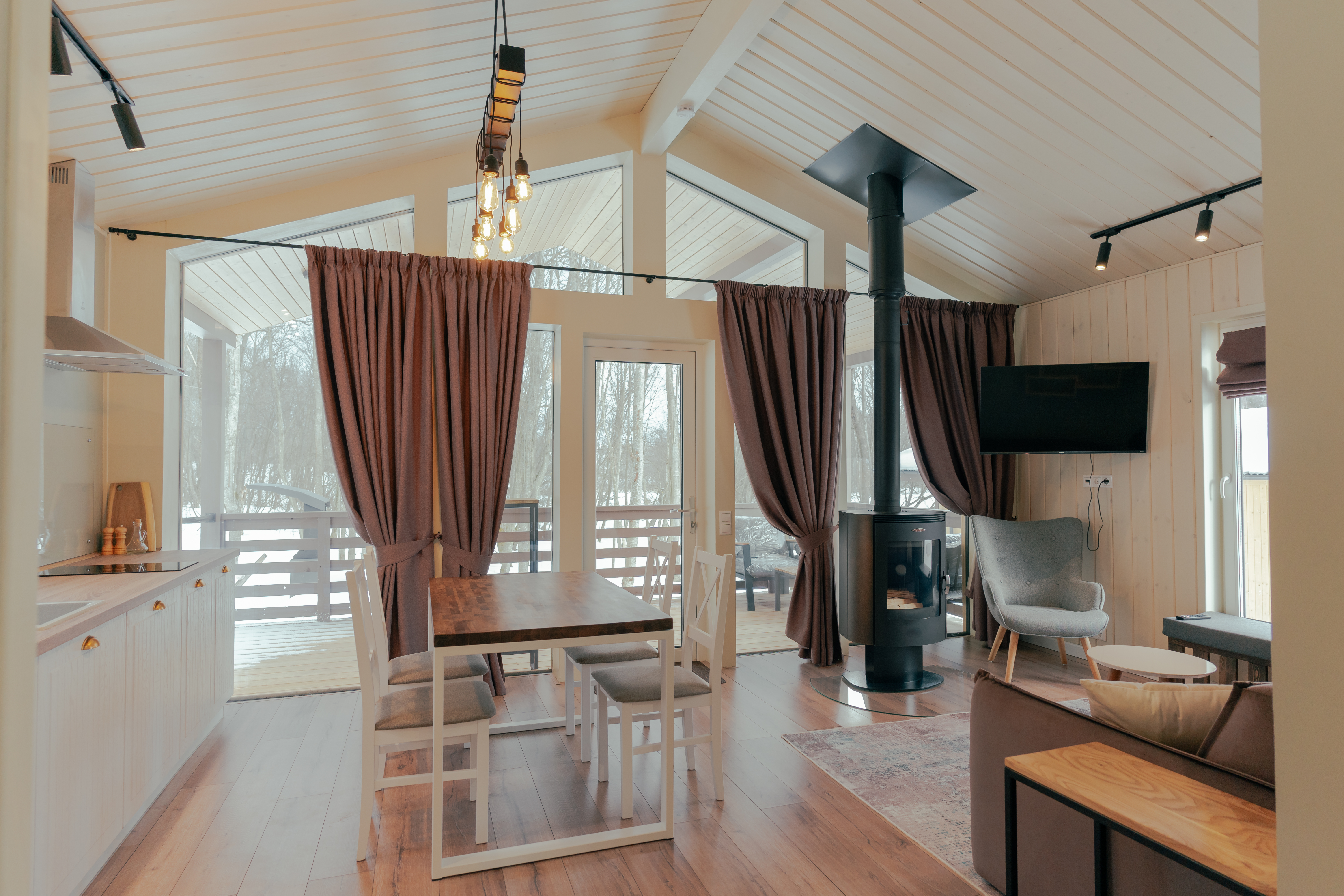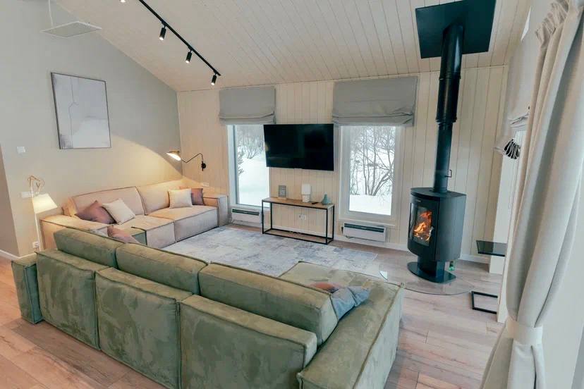 В гостиной каждого лоджа – дровяной камин с зоной отдыха и обеденная зона с функциональной кухней, оснащенной всем необходимым для приготовления семейного обеда или романтического ужина.