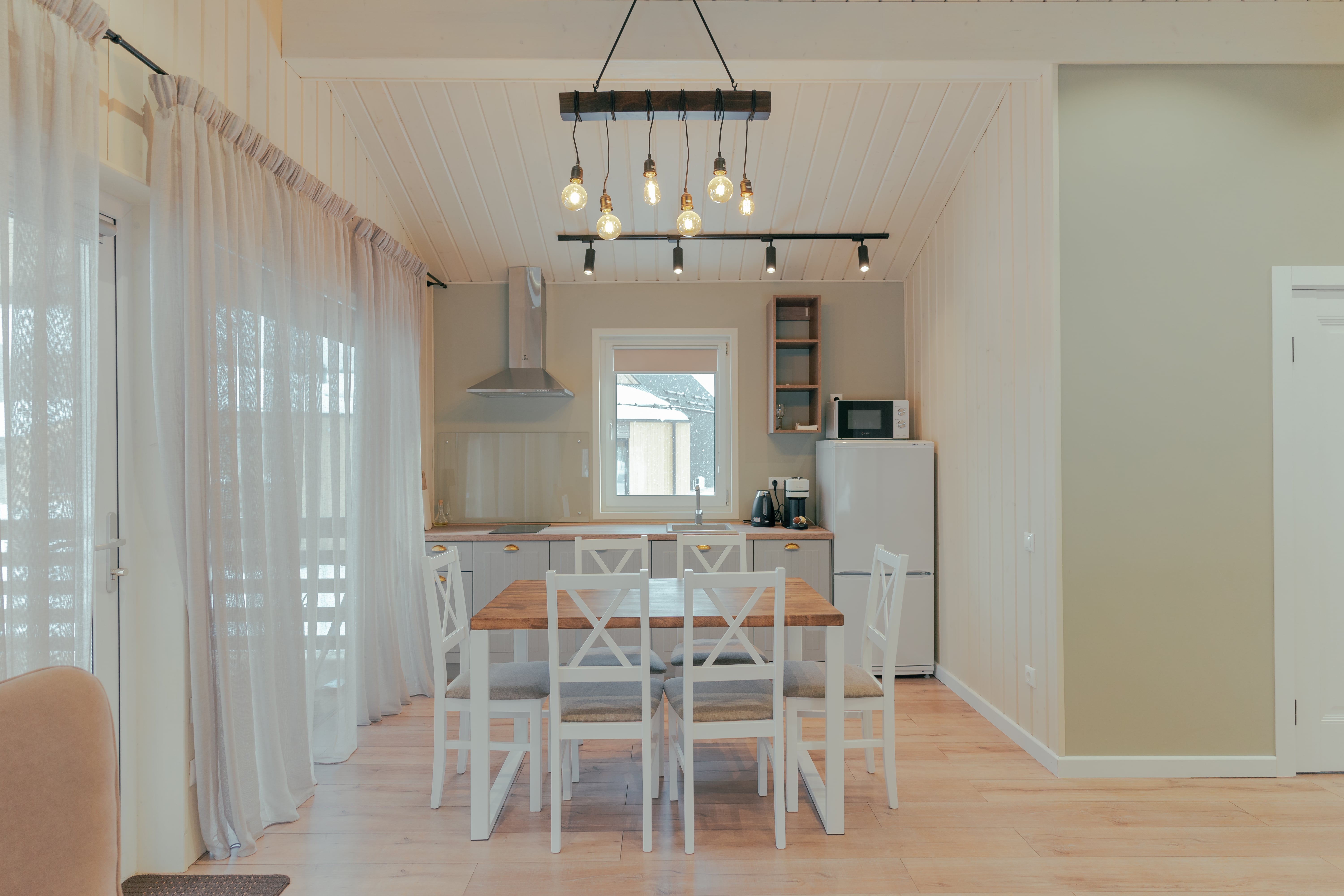 Интерьер выполнен в скандинавском стиле с использованием экологичных материалов, натуральных фактур, которые дополняют ощущение единения с природой.
