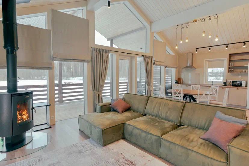 - Гостиную с оборудованной кухней, обеденной зоной, зоной отдыха с диваном и камином
