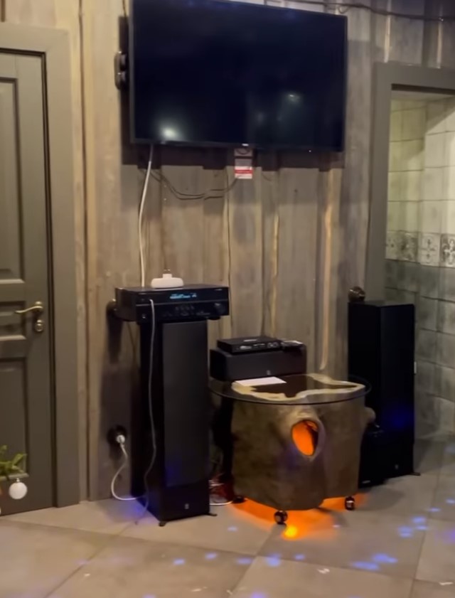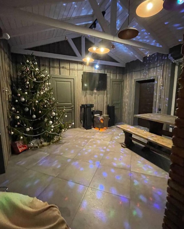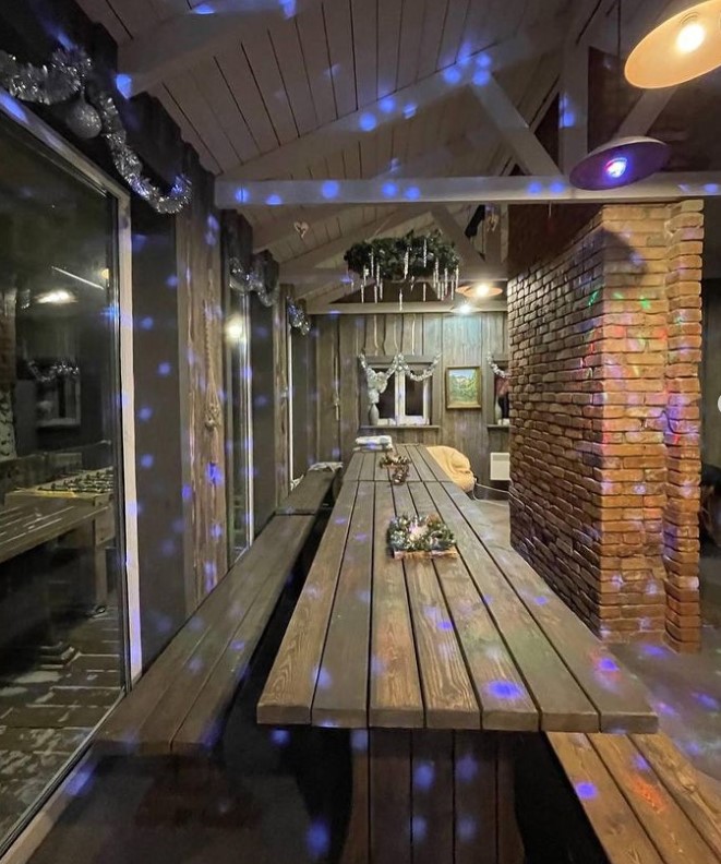 В этом домике есть камин-печь, стол на 12-15 гостей, приличная акустика, караоке, большой ТВ, дартс, кикер и даже профессиональный аппарат для приготовления попкорна.