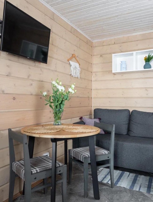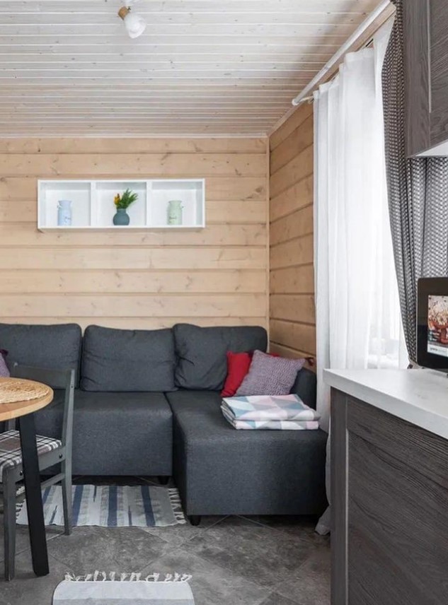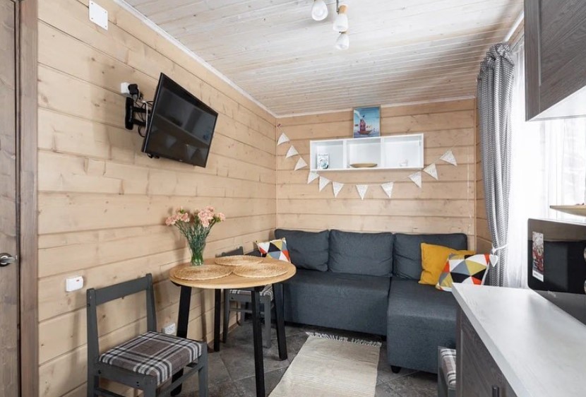 Гостиная домика совмещена с кухней и имеет дополнительное спальное место.