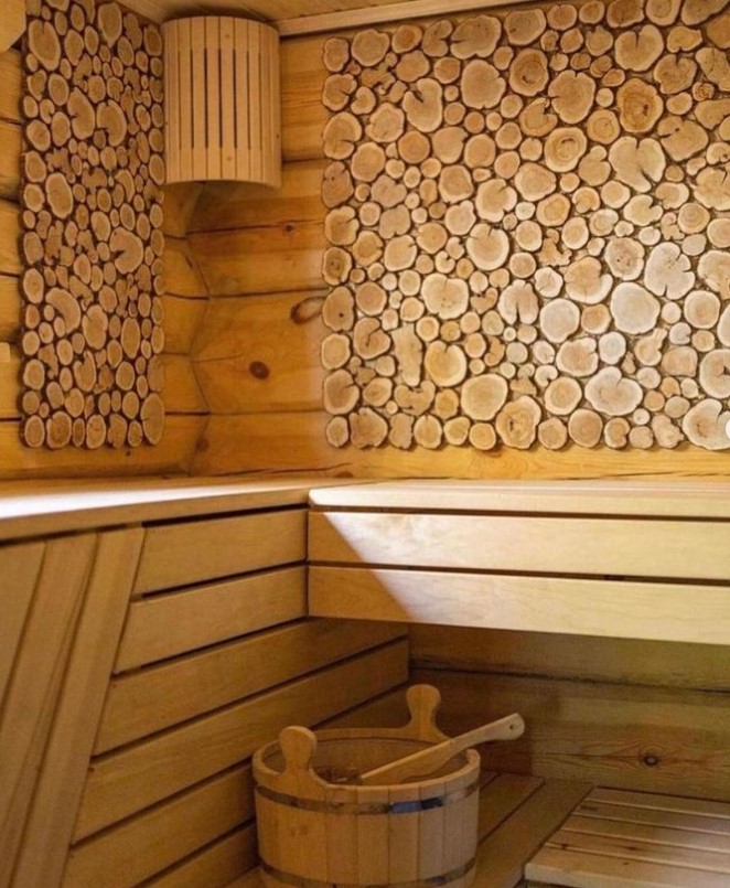 Баня построена из лиственницы. В ней есть все необходимое: кухня, зона отдыха, душевая и, конечно, парная с финской печкой Отделка в парной из можжевельника.
