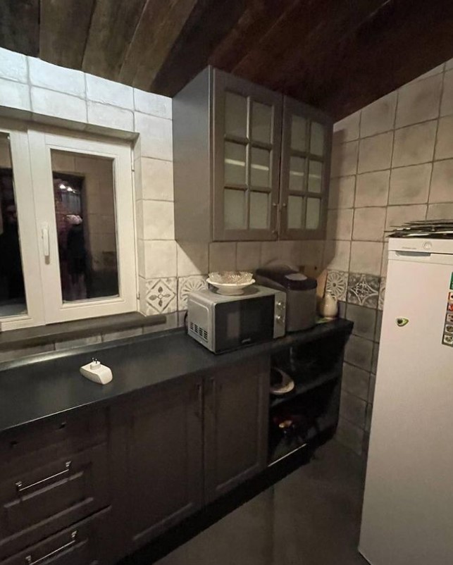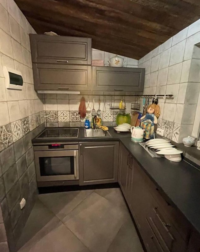 • Кухня-гостиная: двуспальный диван, телевизор, холодильник, газовая плита, духовой шкаф, микроволновая печь, электрический чайник, гейзерная кофеварка, набор посуды для приготовления еды, набор посуды для сервировки на 4 человека, стол, стулья.