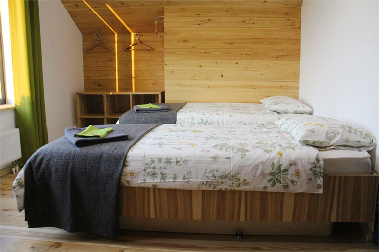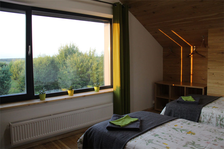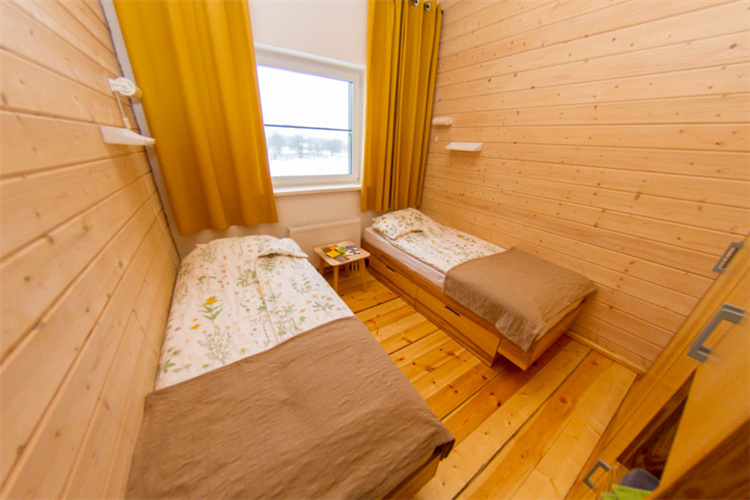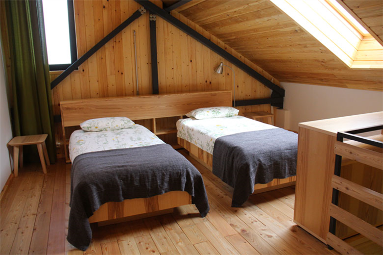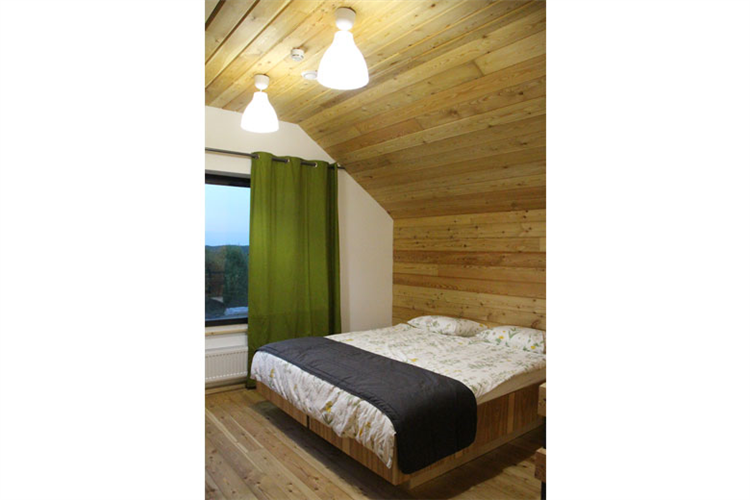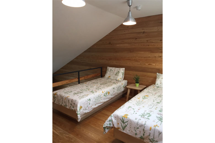 На 2 этаже свой небольшой с\у и две отдельные спальни: 1 спальня с панорамным видом на лес, вторая с окном на теплицу, в обеих возможно либо 2 односпальные кровати, либо 1 большая кровать с 1 кресло-кроватью.