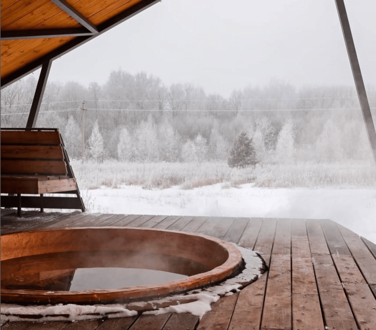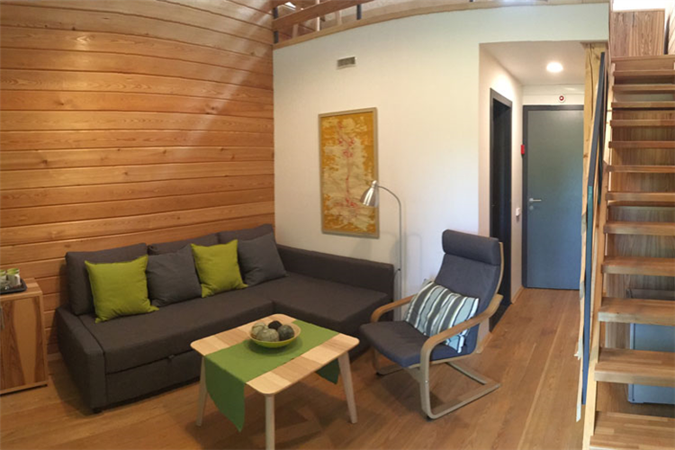 Двухэтажный номер располагает отдельным с\у с душем и панорамным окном на 2 этаже с видом на лес в гостиной.