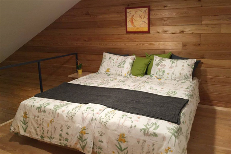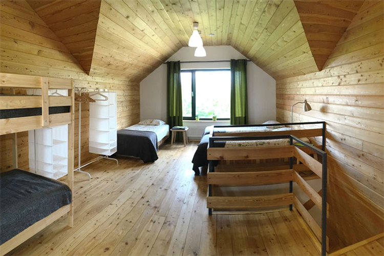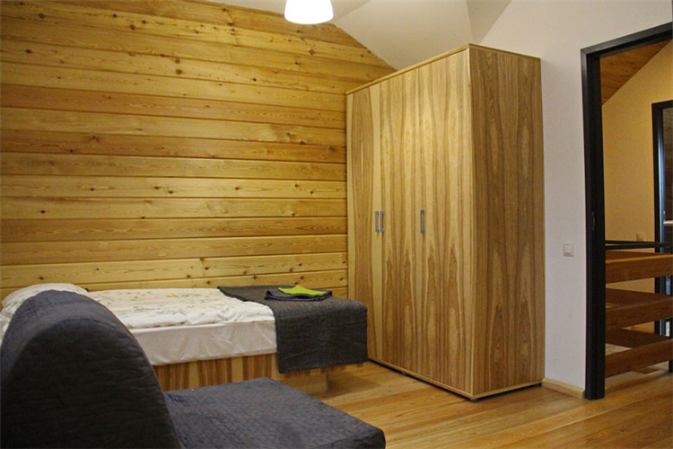 На 2 этаже: большая мансардная комната с панорамным видом на лес и вторым окном на теплицу, 3 односпальные кровати (либо 1 большая и 1 односпальная кровать), 1 двухъярусная кровать и 1 кресло-кровать.