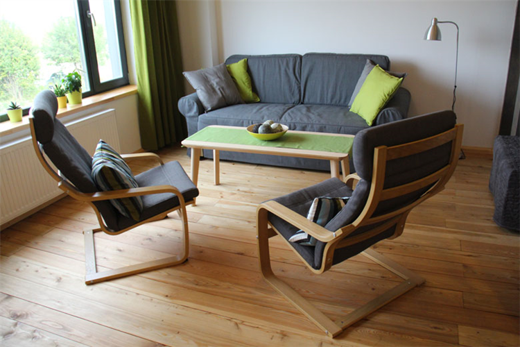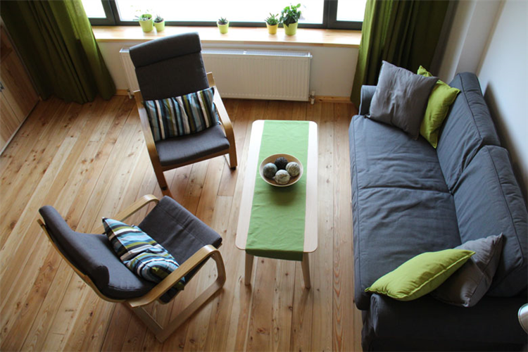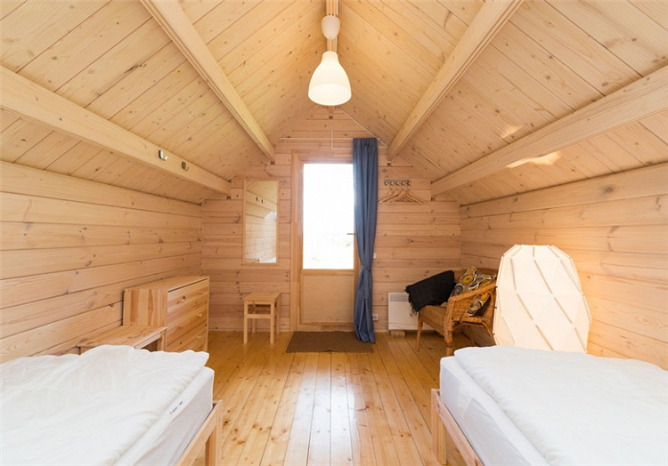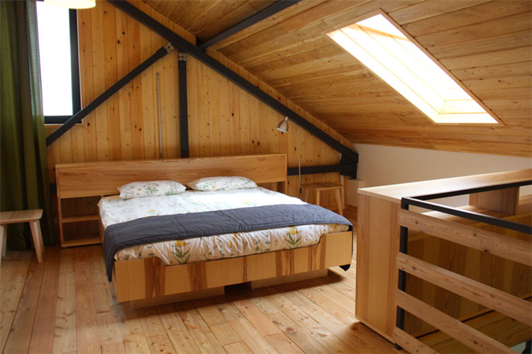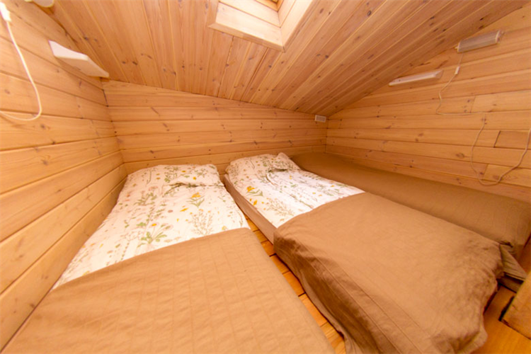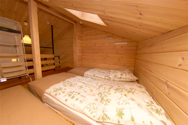 Гостиная с раскладным двухместным диваном и возможностью установки дополнительно 1 кресло-кровати и мансардная спальня этажом выше: либо с 2 односпальными кроватями, либо с 1 большой кроватью и так же с возможностью установки дополнительно 1 кресло-кровати.