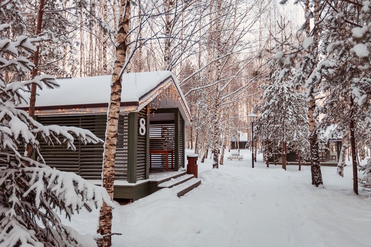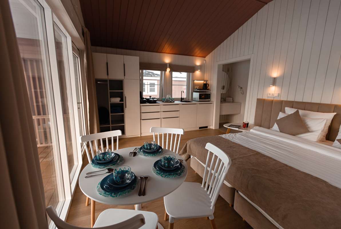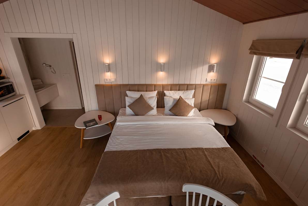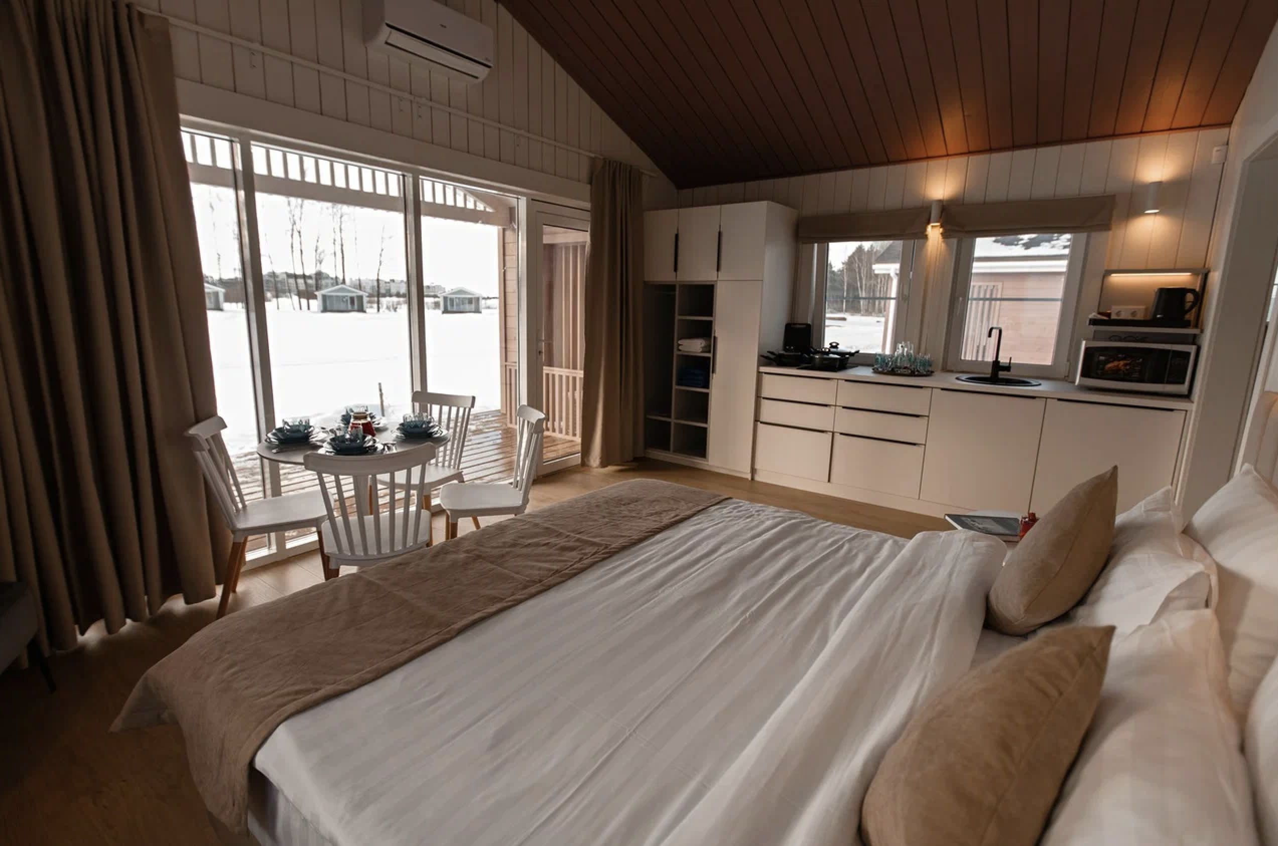 Каждый домик рассчитан на проживание четырёх человек. Уют создаётся за счёт интерьера, оформленного в скандинавском стиле: