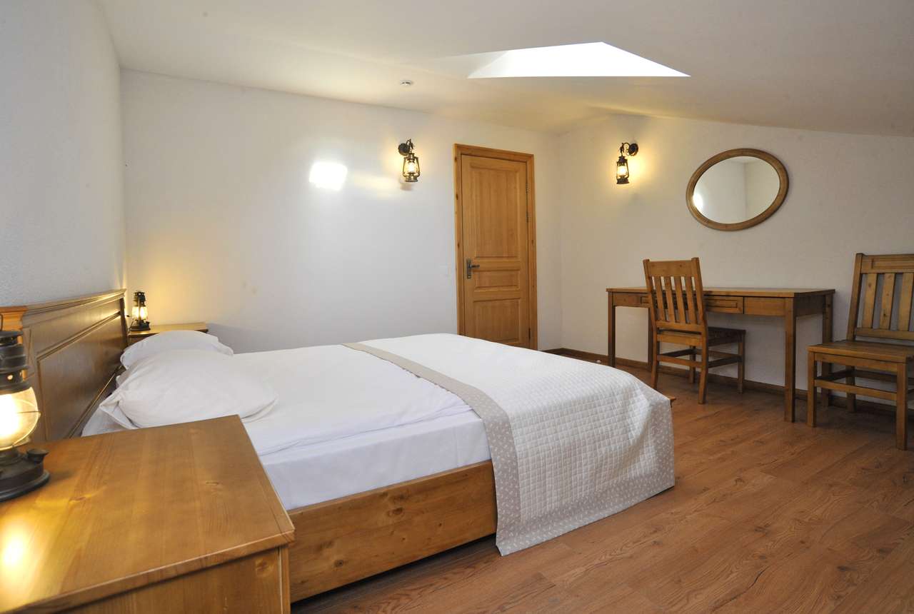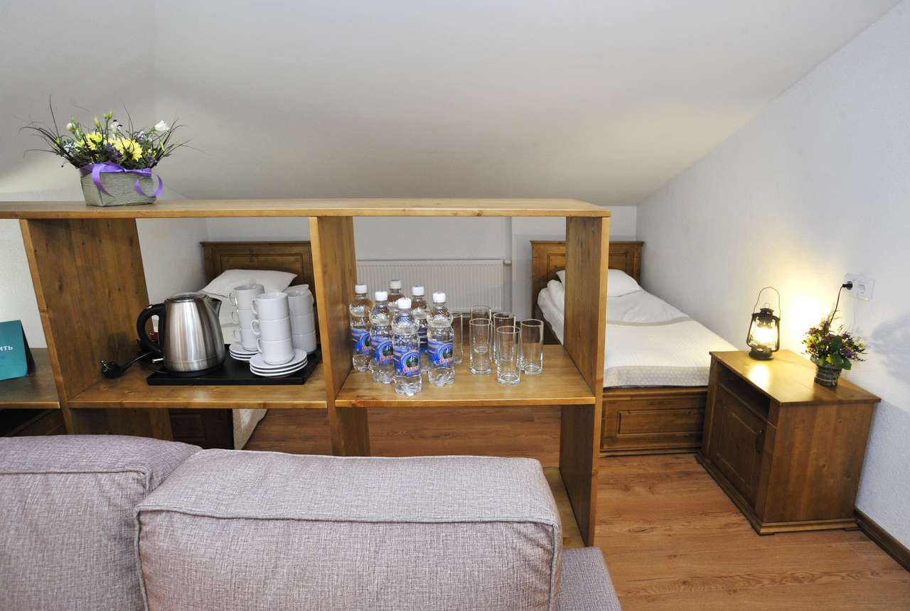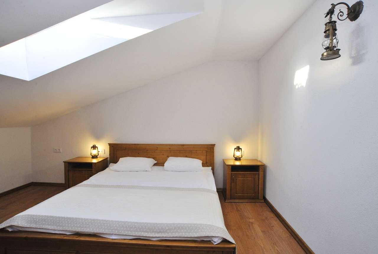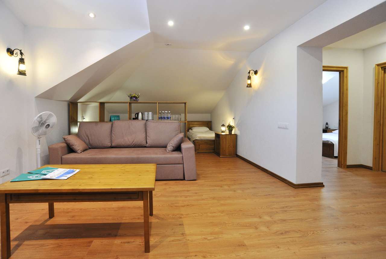 Номер состоит из двух просторных комнат: спальни с широкой двуспальной кроватью и удобно зонированой спальни-гостиной. Большая гостиная, расположенная на мансарде позволяет свободно разместить до 8 человек. Две спальные зоны состоят из двух односпальных кроватей каждая, а центральная часть комнаты выделена в уютную диванную зону (диваны раскладываются в двуспальные) с большим журнальным столиком.