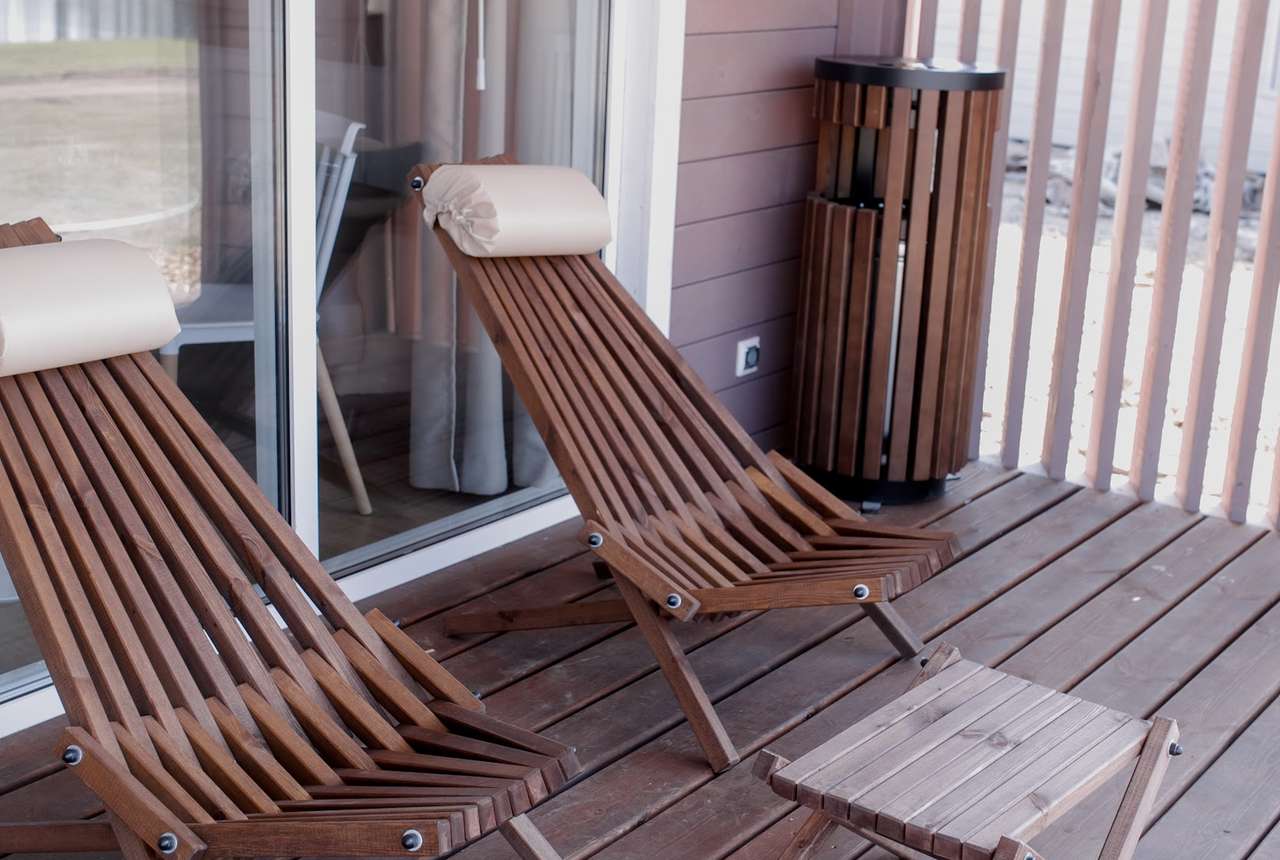 Рядом с каждым домиком есть деревянная обеденная группа.
