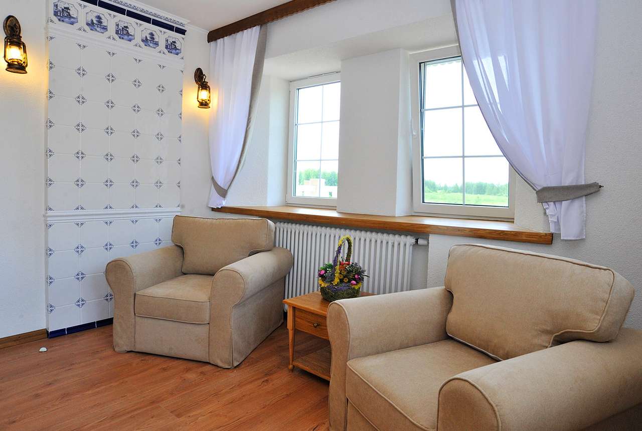 Взрослым наверняка придётся по вкусу отдых в уютном зале «Трактира» у камина или на террасе с видом на озеро. Подобрать номер или домик легко для любой компании: от двухместного стандарта до двухкомнатного люкса с большим балконом. В кемпинговых домиках можно разместиться вчетвером. На территории комплекса работает прокат велосипедов, самокатов и другого оборудования.