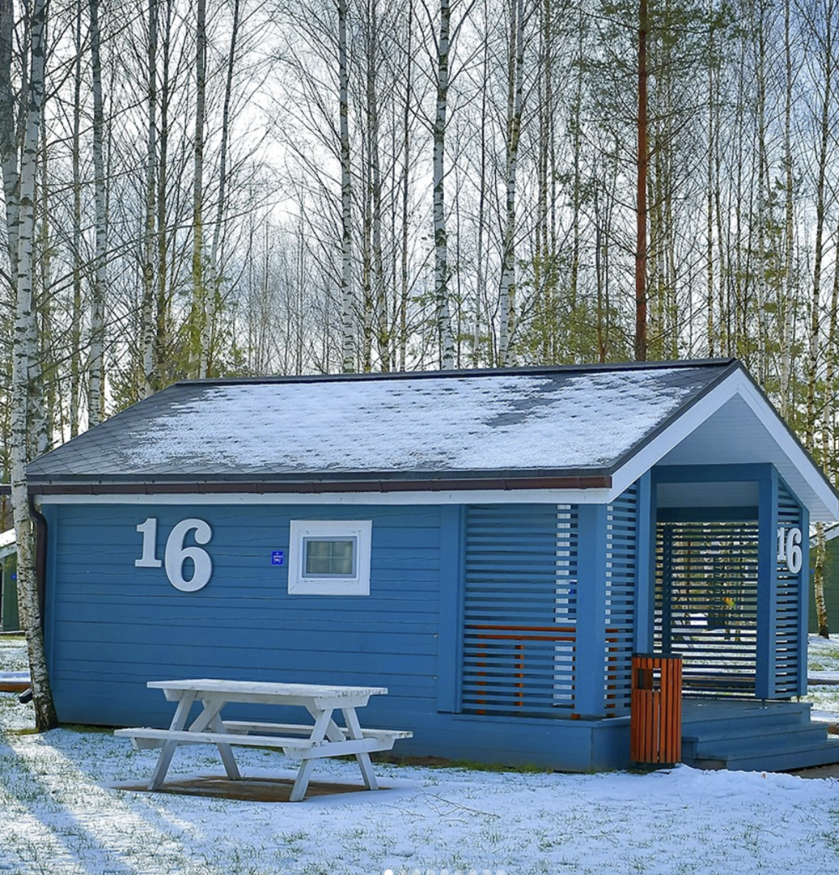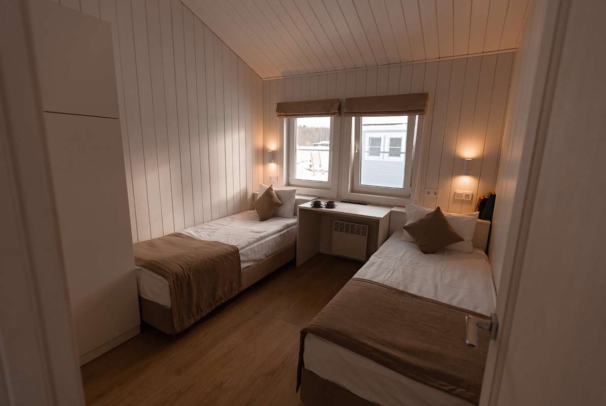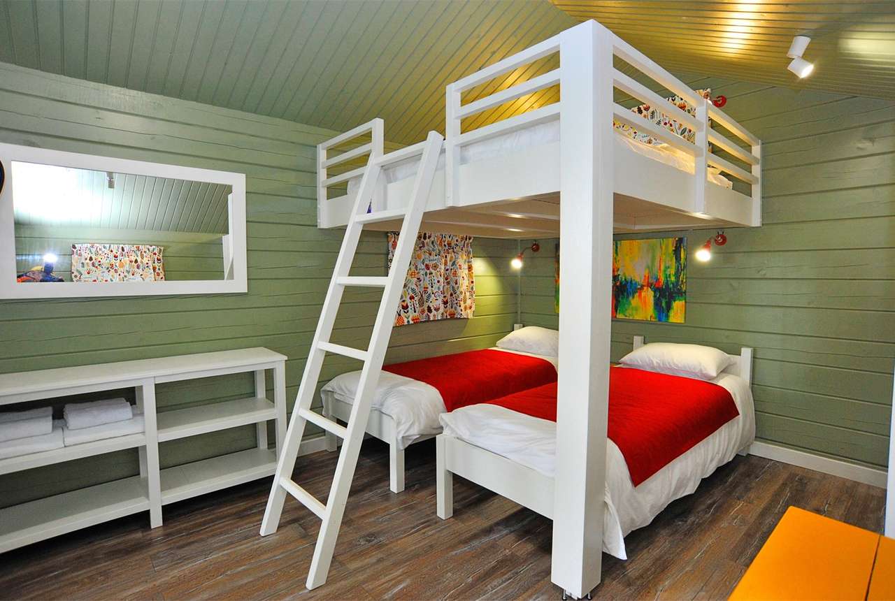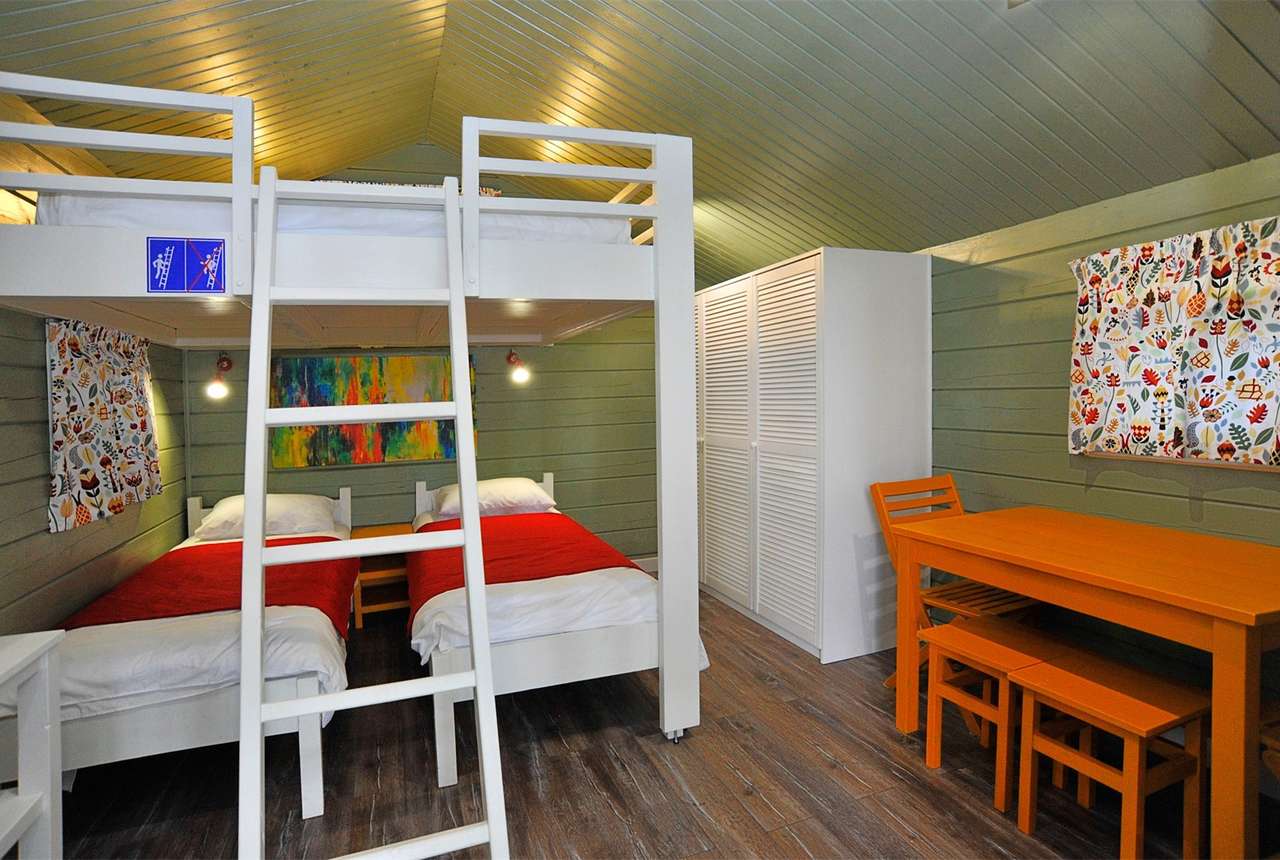 Каждый домик рассчитан на проживание четырёх человек. Уют создаётся за счёт интерьера, оформленного в скандинавском стиле: двухъярусная кровать, состоящая из двух полуторных кроватей на первом ярусе, и одной большой двуспальной кровати - на втором; шкаф; терраса.