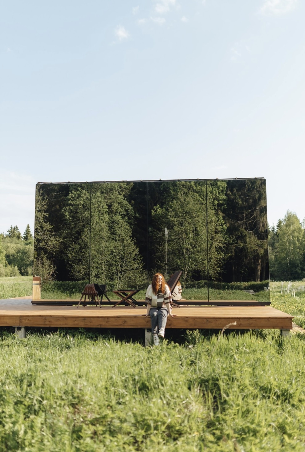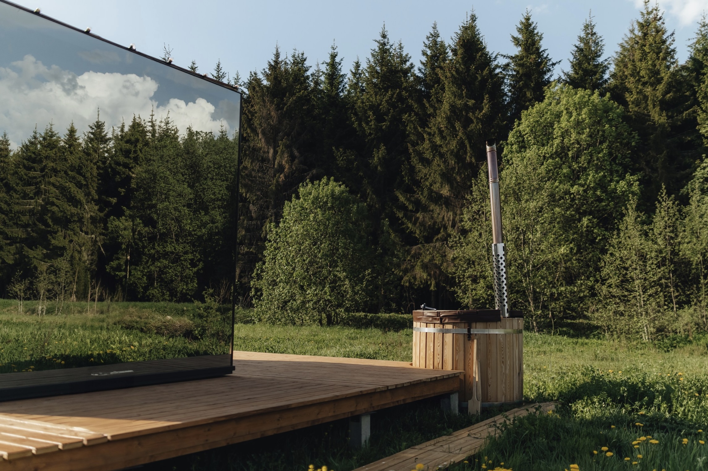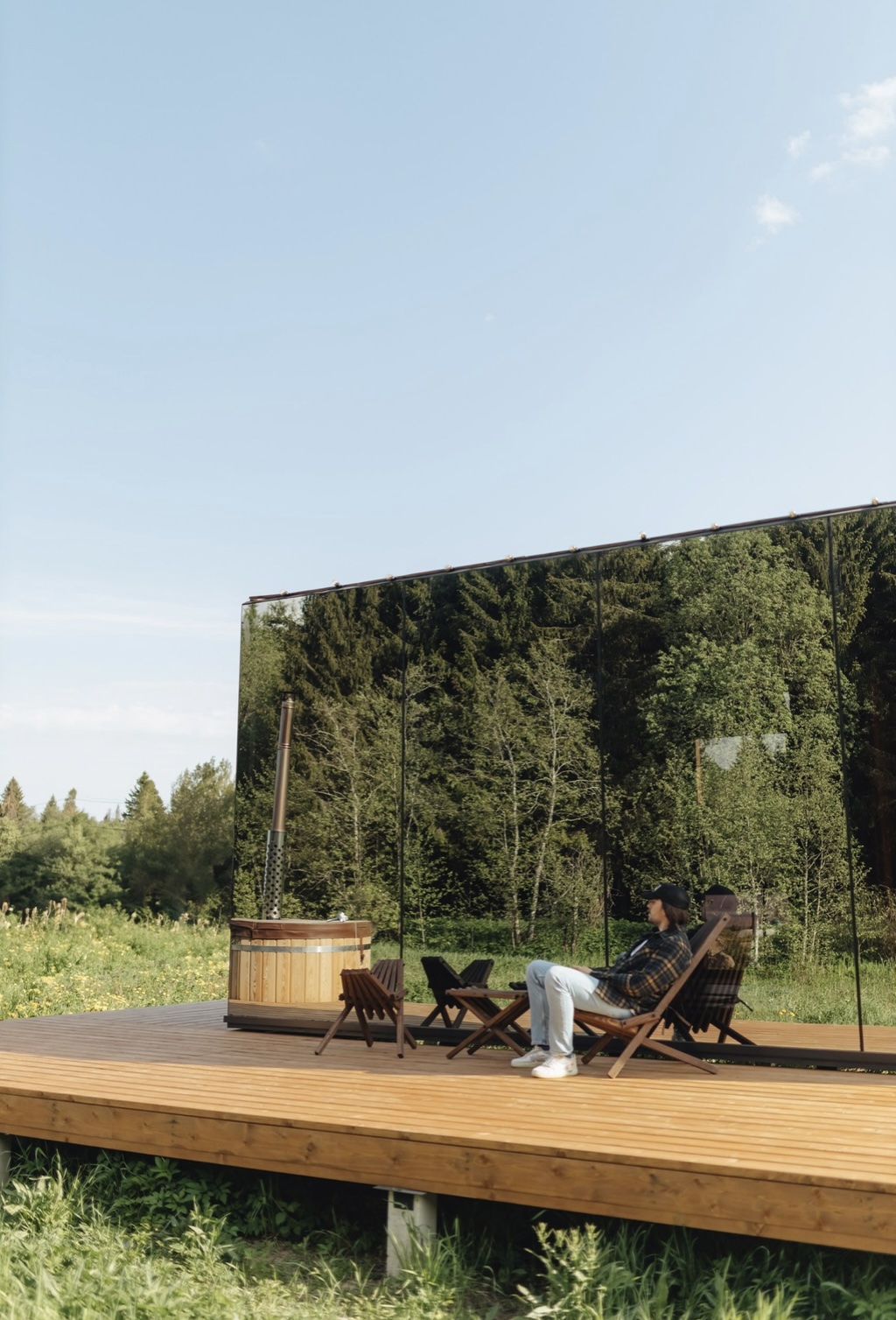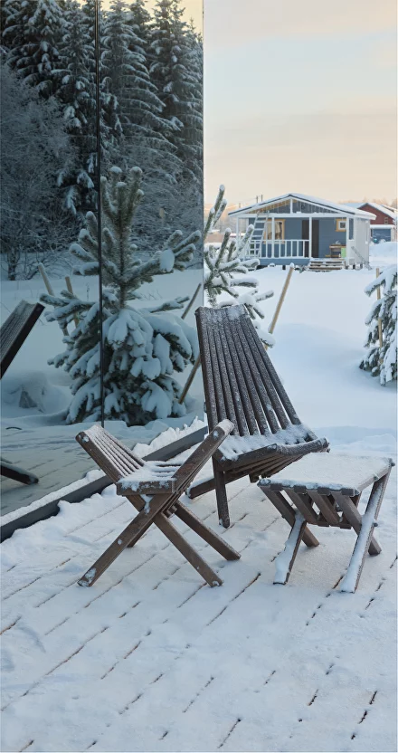 Особенностью этого места является уникальный зеркальный дом с панорамными окнами, которые позволяют наслаждаться красотой природы, не выходя из дома. А прозрачная душевая добавляет особый шарм и позволяет почувствовать себя частью природы.