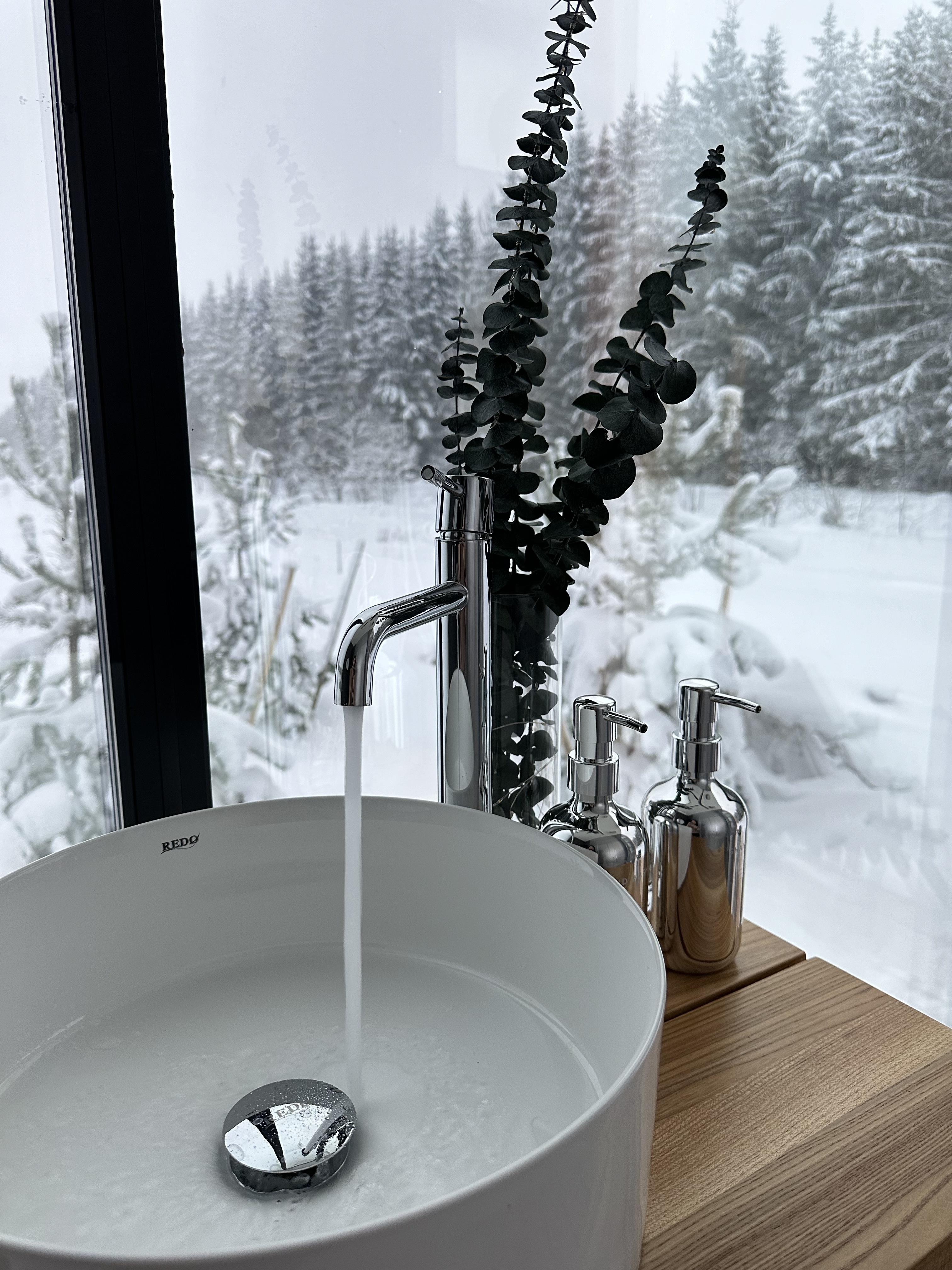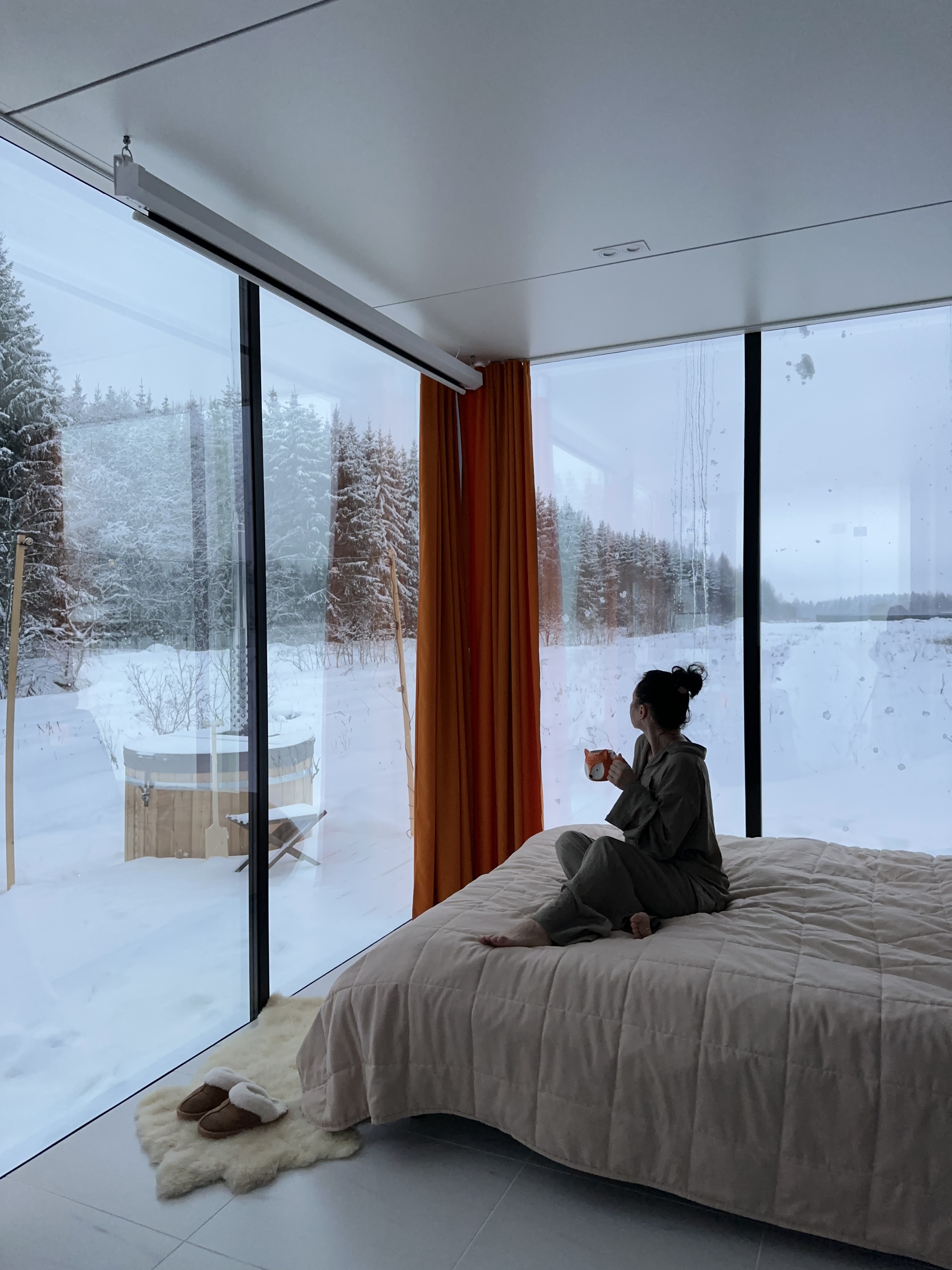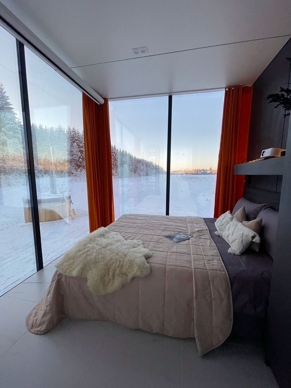 Внутри обогрев теплыми полами, кондиционер, душевая, туалет, оборудованная кухня с микроволновкой печью, двухспальная кровать, постельное белье, полотенца, халаты за дополнительную плату.