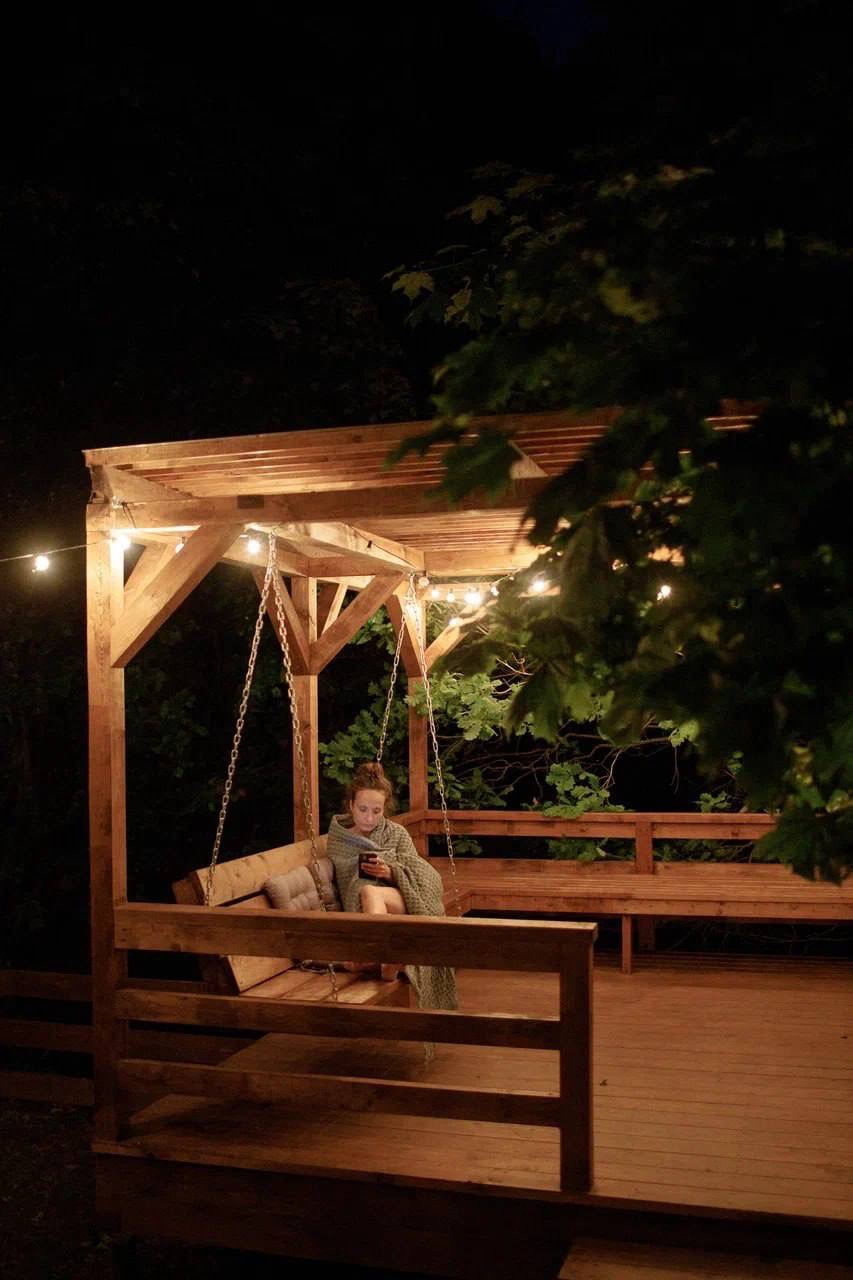 У каждого домика есть собственная зона отдыха с качелями и мангальной зоной для романтических вечеров и семейных посиделок.