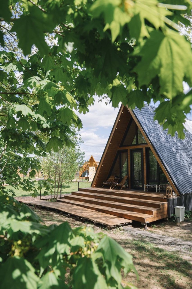 На территории в 20 соток находятся два комфортабельных домика в стиле A-frame, каждый из которых оборудован японской баней (горячей купелью). Кроме того, на территории глэмпинга вас будет ждать баня с панорамным остеклением.